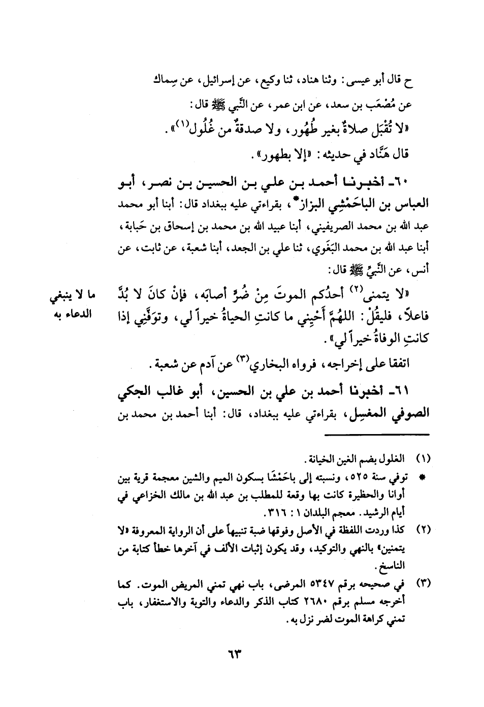 60- أخبرنا أحمد بن علي بن الحسين بن نصر أبو العباس بن الباحمشي البزاز بقراءتي عليه ببغداد قال أبنا أبو محمد عبد الله بن محمد الصريفيني أبنا عبيد الله بن محمد بن إسحاق بن حبابة أبنا عبد الله بن محمد البغوي ثنا علي بن الجعد أبنا شعبة عن ثابت عن أنس عن النبي صلى الله عليه وسلم قال لا يتمنى أحدكم الموت من ضر أصابه فإن كان لا بد فاعلا فليقل اللهم أحيني ما كانت الحياة خيرا لي وتوفني إذا كانت الوفاة خيرا لي.