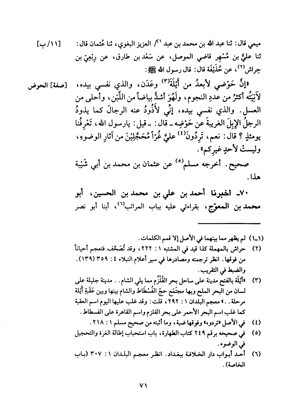 70- أخبرنا أحمد بن علي بن محمد بن الحسين أبو محمد بن المعوج بقراءتي عليه بباب المراتب أبنا أبو نصر -[72]- محمد بن محمد بن علي الصوفي قال قرئ على أبي طاهر محمد بن عبد الرحمن بن العباس الذهبي وأنا حاضر قال ثنا عبد الله بن محمد بن عبد العزيز البغوي ثنا عبد الرحمن بن صالح الأزدي ثنا أبو معاوية عن الأعمش عن المسيب بن رافع عن تميم بن طرفة عن جابر بن سمرة قال قال رسول الله صلى الله عليه وسلم لينتهين أقوام يرفعون أبصارهم إلى السماء في الصلاة أو لا ترجع إليهم.