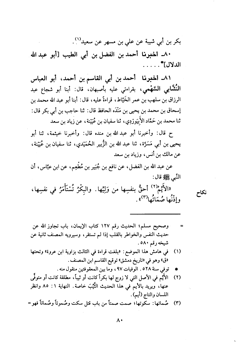81- أخبرنا أحمد بن أبي القاسم بن أحمد أبو العباس النشابي السهمي بقراءتي عليه بأصبهان قال أبنا أبو شجاع عبد الرزاق بن سلهب بن عمر الخياط قراءة عليه قال أبنا أبو عبد الله محمد بن إسحاق بن محمد بن يحيى بن منده الحافظ قال ثنا حاجب بن أبي بكر قال ثنا محمد بن حماد الأبيوردي ثنا سفيان بن عيينة عن زياد بن سعد. ح قال وأخبرنا أبو عبد الله بن منده قال وأخبرنا خيثمة ثنا أبو يحيى بن أبي مسرة ثنا عبد الله بن الزبير الحميدي ثنا سفيان بن عيينة عن مالك بن أنس وزياد بن سعد عن عبد الله بن الفضل عن نافع بن جبير بن مطعم عن ابن عباس أن النبي صلى الله عليه وسلم قال الأيم أحق بنفسها من وليها والبكر تستأمر في نفسها وإذنها صماتها.