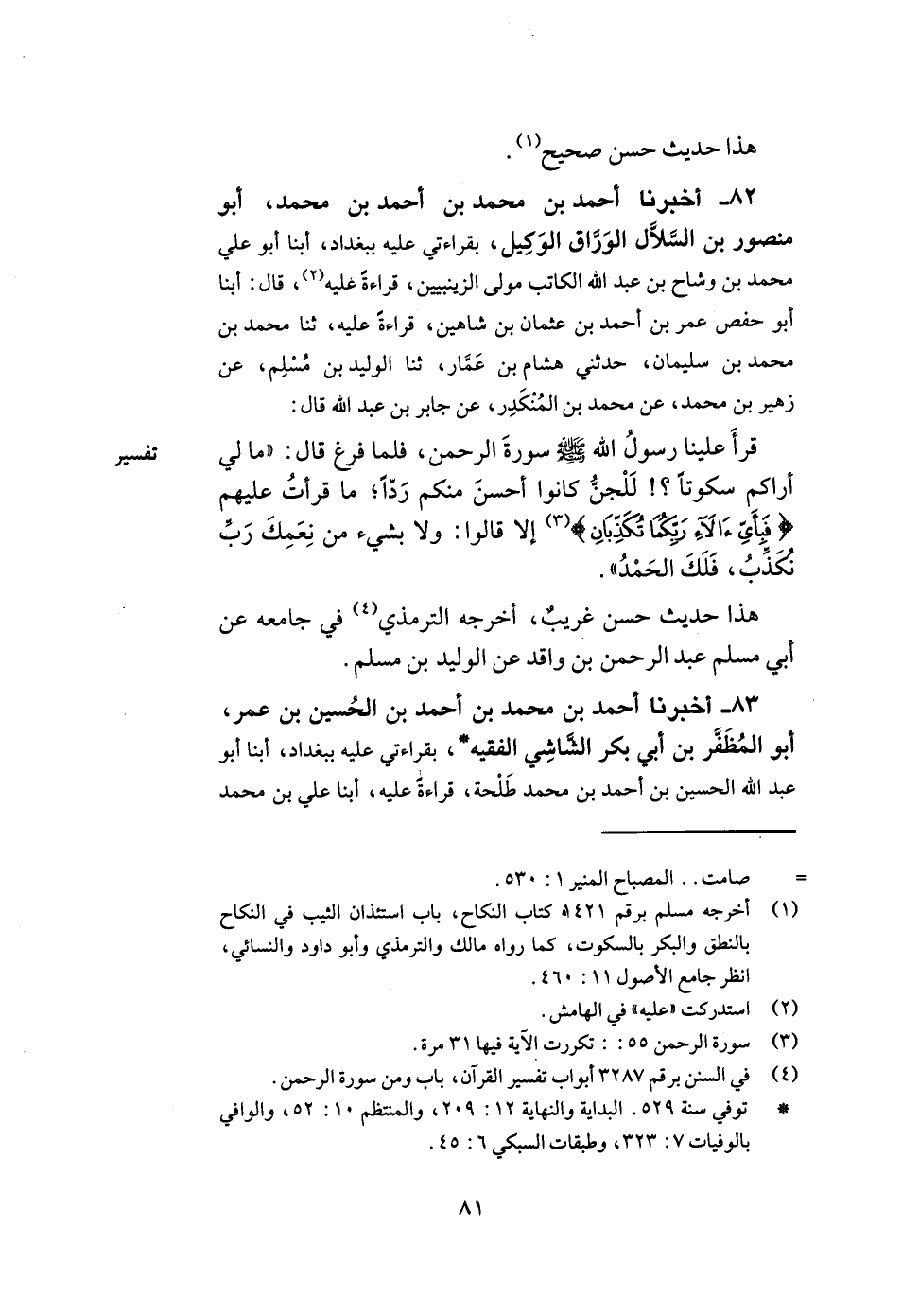 82- أخبرنا أحمد بن محمد بن أحمد بن محمد أبو منصور بن السلال الوراق الوكيل بقراءتي عليه ببغداد أبنا أبو علي محمد بن وشاح بن عبد الله الكاتب مولى الزينبيين قراءة عليه قال أبنا أبو حفص عمر بن أحمد بن عثمان بن شاهين قراءة عليه ثنا محمد بن محمد بن سليمان حدثني هشام بن عمار ثنا الوليد بن مسلم عن زهير بن محمد عن محمد بن المنكدر عن جابر بن عبد الله قال قرأ علينا رسول الله صلى الله عليه وسلم سورة الرحمن فلما فرغ قال مالي أراكم سكوتا للجن كانوا أحسن منكم ردا ما قرأت عليهم: {فبأي آلاء ربكما تكذبان} إلا قالوا ولا بشيء من نعمك رب نكذب فلك الحمد.
