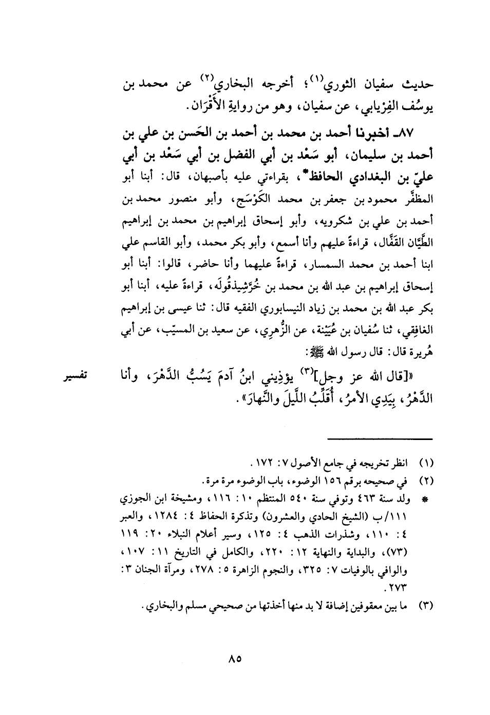 87- أخبرنا أحمد بن محمد بن أحمد بن الحسن بن علي بن أحمد بن سليمان أبو سعد بن أبي الفضل بن أبي سعد بن أبي علي بن البغدادي الحافظ بقراءتي عليه بأصبهان قال أبنا أبو المظفر محمود بن جعفر بن محمد الكوسج وأبو منصور محمد بن أحمد بن علي بن شكرويه وأبو إسحاق إبراهيم بن محمد بن إبراهيم الطيان القفال قراءة عليهم وأنا أسمع وأبو بكر محمد وأبو القاسم علي ابنا أحمد بن محمد السمسار قراءة عليهما وأنا حاضر قالوا أبنا أبو إسحاق إبراهيم بن عبد الله بن محمد بن خرشيذ قوله قراءة عليه أبنا أبو بكر عبد الله بن محمد بن زياد النيسابوري الفقيه قال ثنا عيسى بن إبراهيم الغافقي ثنا سفيان بن عيينة عن الزهري عن سعيد بن المسيب عن أبي هريرة قال قال رسول الله صلى الله عليه وسلم قال الله عز وجل يؤذيني ابن آدم يسب الدهر وأنا الدهر بيدي الأمر أقلب الليل والنهار.