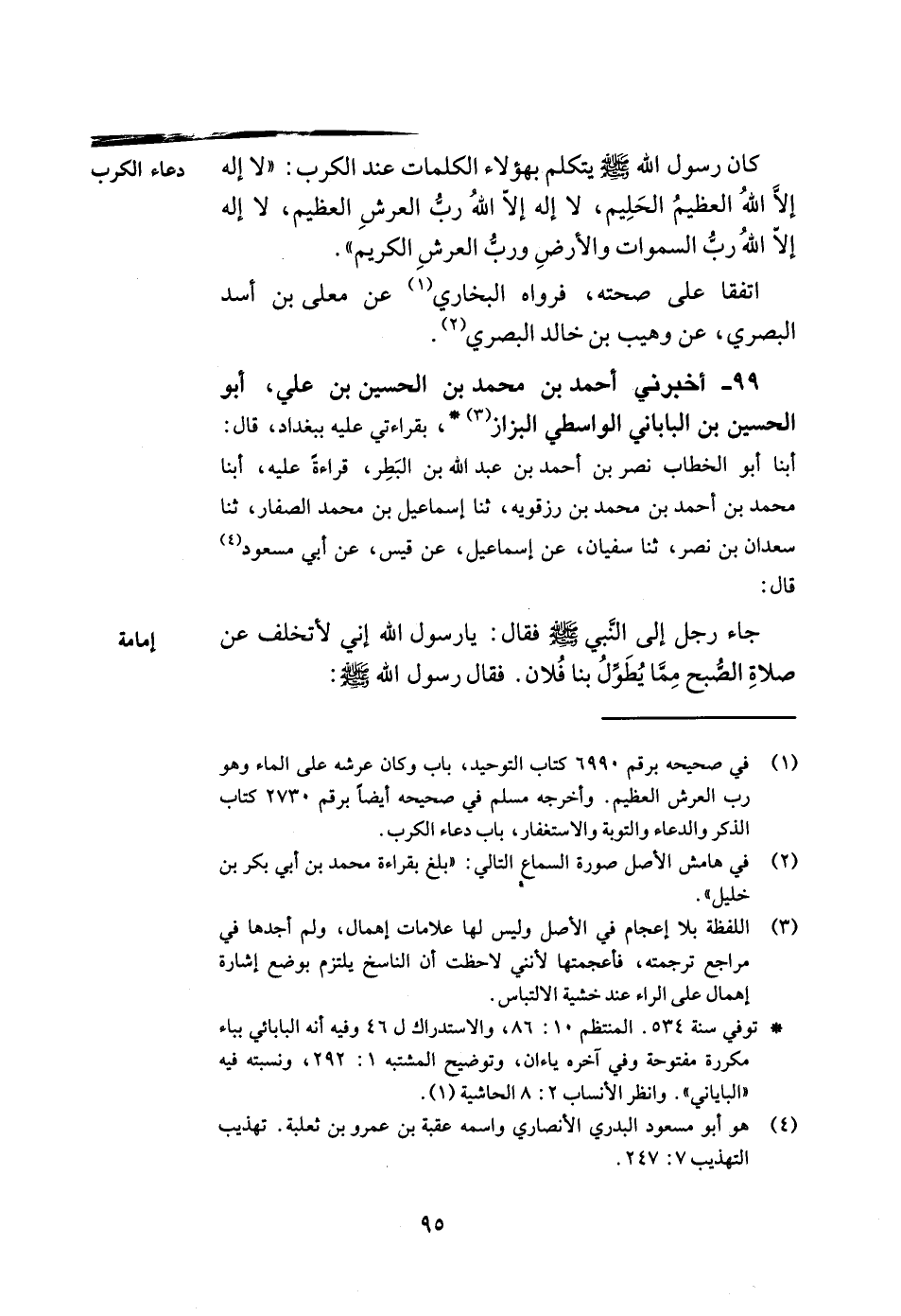 99- أخبرني أحمد بن محمد بن الحسين بن علي أبو الحسين بن الباباني الواسطي البزاز بقراءتي عليه ببغداد قال أبنا أبو الخطاب نصر بن أحمد بن عبد الله بن البطر قراءة عليه أبنا محمد بن أحمد بن محمد بن رزقويه ثنا إسماعيل بن محمد الصفار ثنا سعدان بن نصر ثنا سفيان عن إسماعيل عن قيس عن أبي مسعود قال جاء رجل إلى النبي صلى الله عليه وسلم فقال يا رسول الله إني لأتخلف عن صلاة الصبح مما يطول بنا فلان فقال رسول الله صلى الله عليه وسلم -[96]- إن منكم منفرين فأيكم أم الناس فليخفف فإن فيهم الكبير والسقيم وذا الحاجة.
