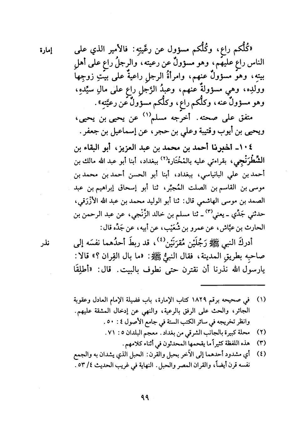 104- أخبرنا أحمد بن محمد بن عبد العزيز أبو البقاء بن الشطرنجي بقراءتي عليه بالمختارة ببغداد أبنا أبو عبد الله مالك بن أحمد بن علي البانياسي ببغداد أبنا أبو الحسن أحمد بن محمد بن موسى بن القاسم بن الصلت المجبر ثنا أبو إسحاق إبراهيم بن عبد الصمد بن موسى الهاشمي قال ثنا أبو الوليد محمد بن عبد الله الأزرقي حدثني جدي يعني ثنا مسلم بن خالد الزنجي عن عبد الرحمن بن الحارث بن عياش عن عمرو بن شعيب عن أبيه عن جده قال أدرك النبي صلى الله عليه وسلم رجلين مقرنين قد ربط أحدهما نفسه إلى صاحبه بطريق المدينة فقال النبي صلى الله عليه وسلم ما بال القران قالا يا رسول الله نذرنا أن نقترن حتى نطوف بالبيت قال أطلقا -[100]- قرانكما فلا نذر إلا ما ابتغي به وجه الله عز وجل.