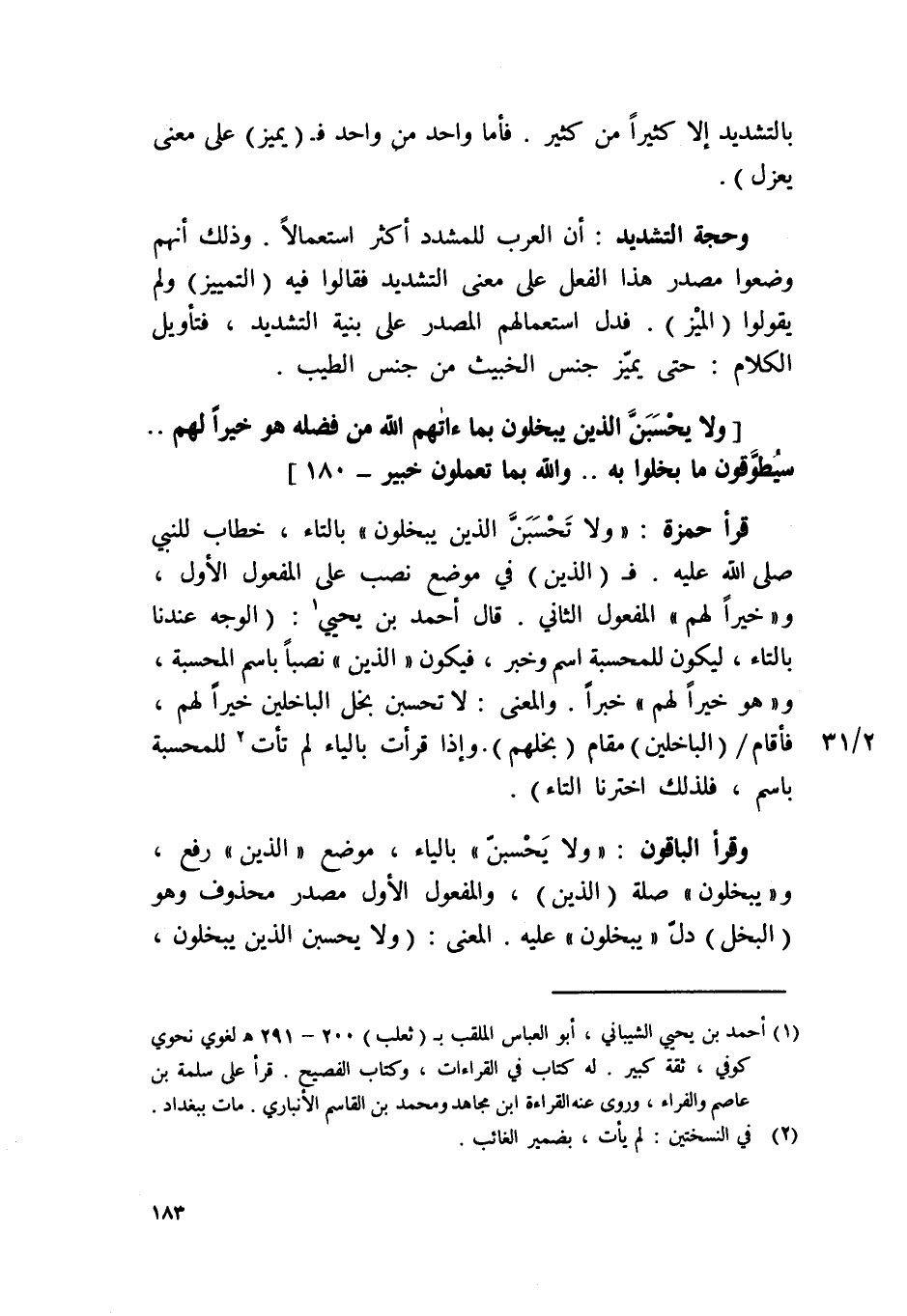 قَرَأَ حَمْزَة / وَلَا تحسبن الَّذين يَبْخلُونَ / بِالتَّاءِ خطاب للنَّبِي صلى الله عَلَيْهِ ف الَّذين فِي مَوضِع نصب على الْمَفْعُول الأول و {خيرا لَهُم} الْمَفْعُول الثَّانِي قَالَ أَحْمد بن يحيى الْوَجْه عندنَا بِالتَّاءِ ليَكُون للمحسبة اسْم وَخبر فَيكون {الَّذين} نصبا باسم المحسبة و {هُوَ خيرا لَهُم} خَبرا وَالْمعْنَى لَا تحسبن بخل الباخلين خيرا لَهُم فَأَقَامَ الباخلين مقَام بخلهم وَإِذا قَرَأت بِالْيَاءِ لم تأت للمحسبة باسم فَلذَلِك اخترنا التَّاء