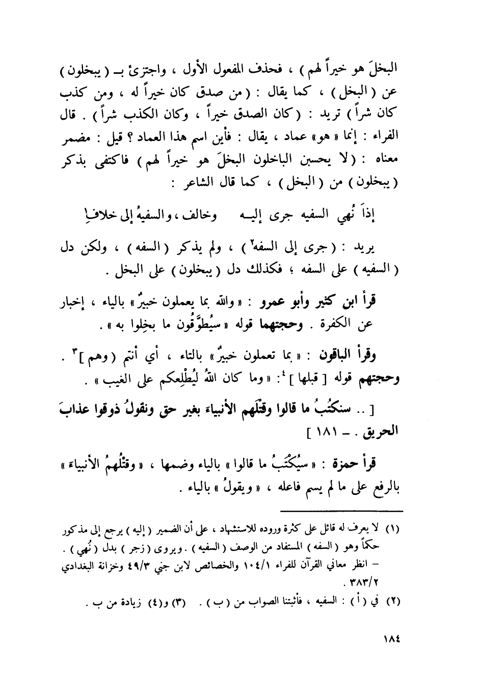 الْبُخْل هُوَ خيرا لَهُم فَحذف الْمَفْعُول الأول واجتزئ ب يَبْخلُونَ عَن الْبُخْل كَمَا يُقَال من صدق كَانَ خيرا لَهُ وَمن كذب كَانَ شرا تُرِيدُ كَانَ الصدْق خيرا وَكَانَ الْكَذِب شرا قَالَ الْفراء إِنَّمَا {هُوَ} عماد يُقَال فَأَيْنَ اسْم هَذَا الْعِمَاد قيل مُضْمر مَعْنَاهُ لَا يَحسبن الباخلون الْبُخْل هُوَ خيرا لَهُم فَاكْتفى بِذكر يَبْخلُونَ من الْبُخْل كَمَا قَالَ الشَّاعِر ... إِذا نهي السَّفِيه جرى إِلَيْهِ ... وَخَالف وَالسَّفِيه إِلَى خلاف ...