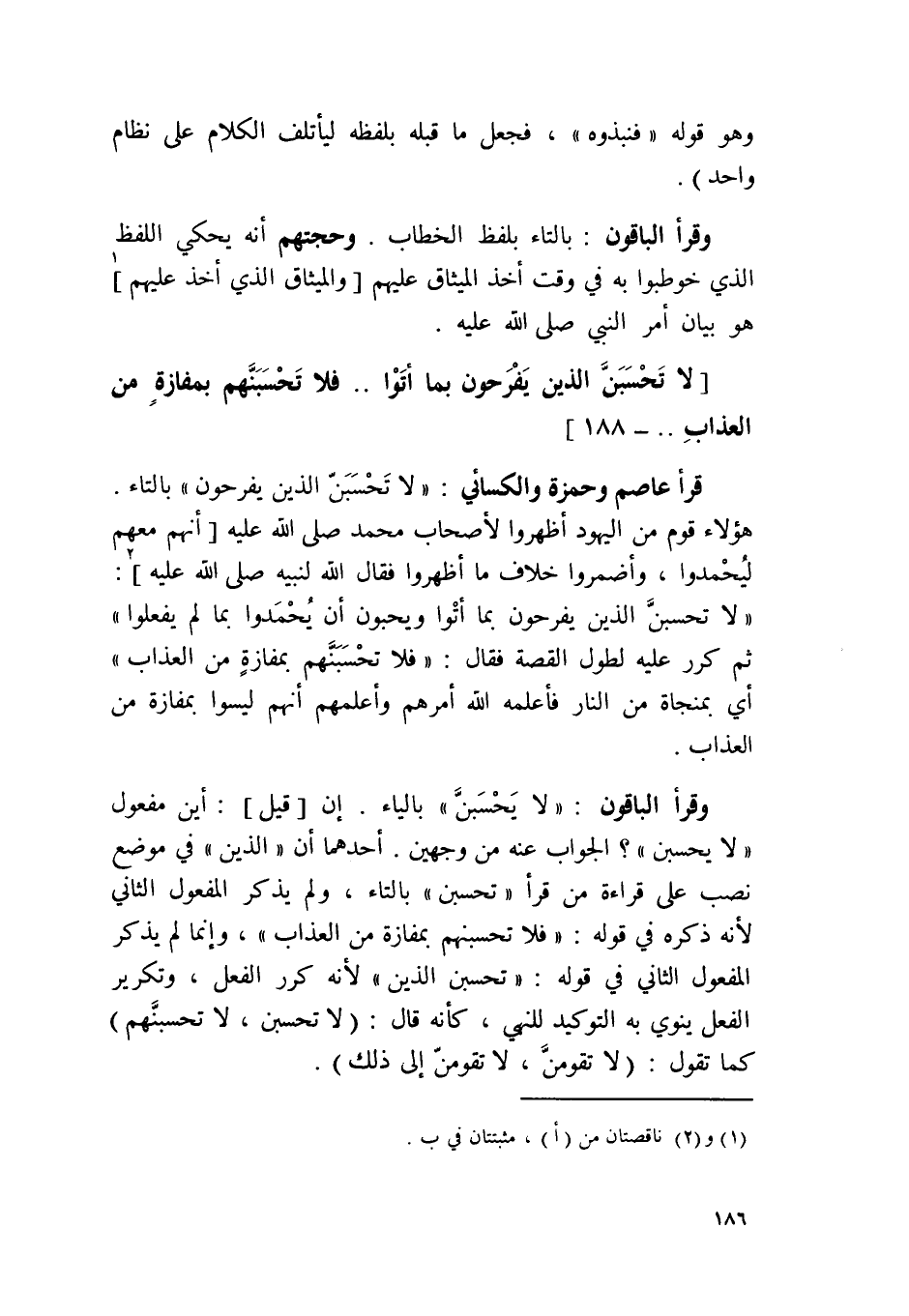 وَقَرَأَ الْبَاقُونَ / لَا يَحسبن / بِالْيَاءِ إِن قيل أَيْن مفعول / لَا يَحسبن / الْجَواب عَنهُ من وَجْهَيْن أَحدهمَا أَن {الَّذين} فِي مَوضِع نصب على قِرَاءَة من قَرَأَ {تحسبن} بِالتَّاءِ وَلم يذكر الْمَفْعُول الثَّانِي لِأَنَّهُ ذكره فِي قَوْله {فَلَا تحسبنهم بمفازة من الْعَذَاب} وَإِنَّمَا لم يذكر الْمَفْعُول الثَّانِي فِي قَوْله {تحسبن الَّذين} لِأَنَّهُ كرر الْفِعْل وتكرير الْفِعْل يَنْوِي بِهِ التوكيد للنَّهْي كَأَنَّهُ قَالَ لَا تحسبن لَا تحسبنهم كَمَا تَقول لَا تقومن لَا تقومن إِلَى ذَلِك