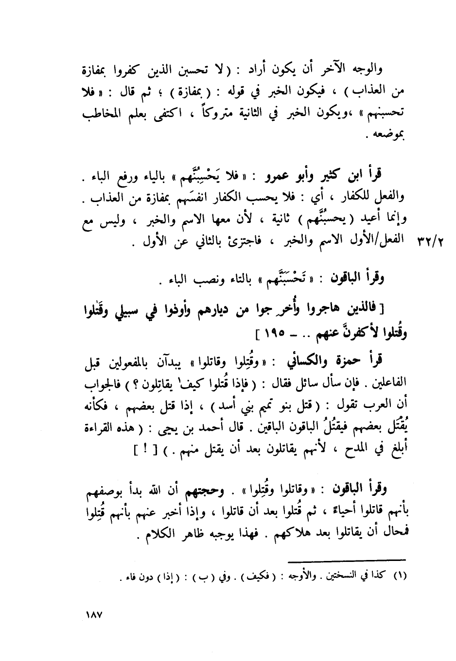 قَرَأَ ابْن كثير وَأَبُو عَمْرو / فَلَا يحسبنهم / بِالْيَاءِ وَرفع الْبَاء وَالْفِعْل للْكفَّار أَي فَلَا يحْسب الْكفَّار أنفسهم بمفازة من الْعَذَاب وَإِنَّمَا أُعِيد يحسبنهم ثَانِيَة لِأَن مَعهَا الِاسْم وَالْخَبَر وَلَيْسَ مَعَ الْفِعْل الأول الِاسْم وَالْخَبَر فاجتزئ بِالثَّانِي عَن الأول