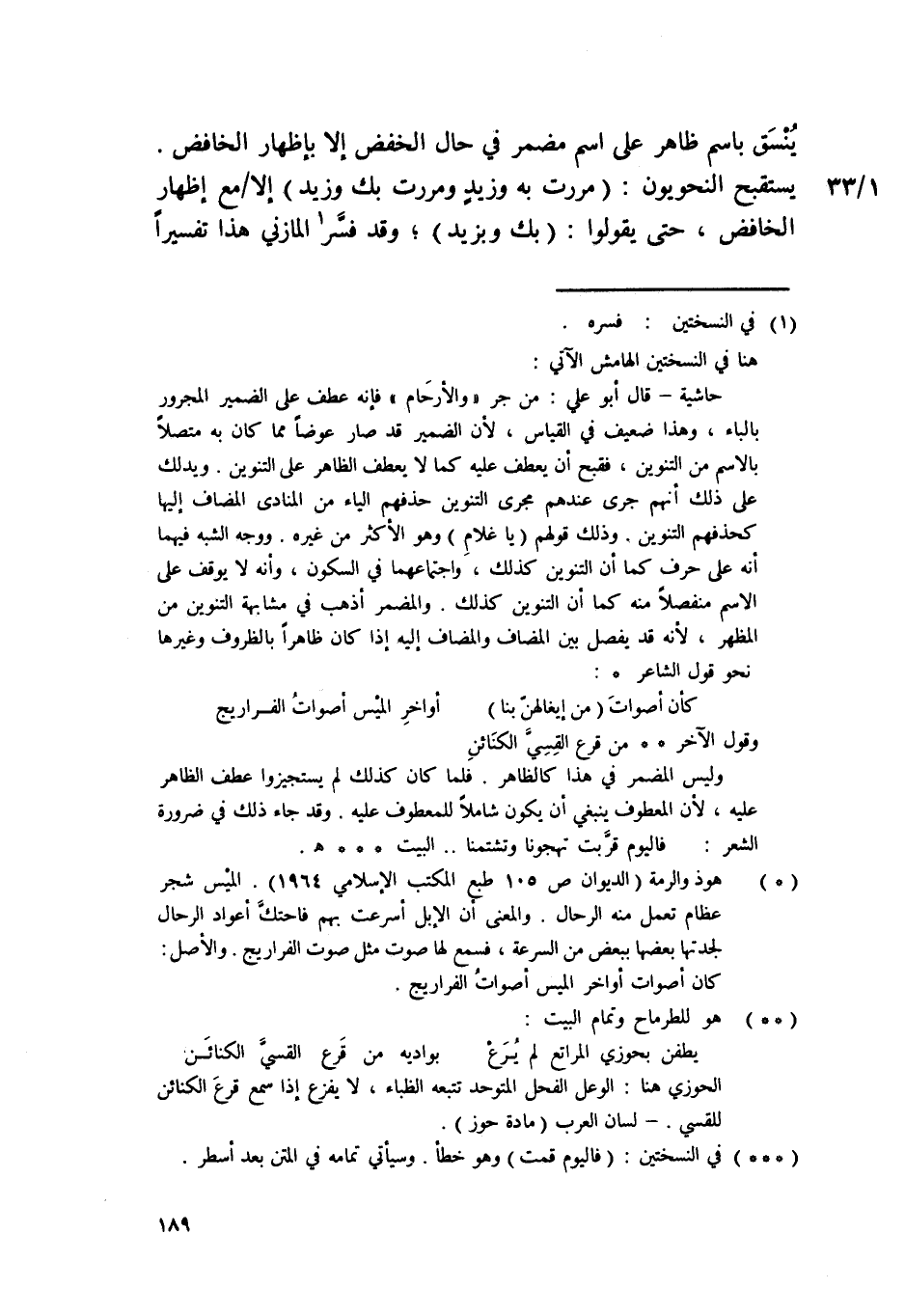 ينسق باسم ظَاهر على اسْم مُضْمر فِي حَال الْخَفْض إِلَّا بِإِظْهَار الْخَافِض يستقبح النحويون مَرَرْت بِهِ وَزيد ومررت بك وَزيد إِلَّا مَعَ إِظْهَار الْخَافِض حَتَّى يَقُولُوا بك وبزيد وَقد فسر الْمَازِني هَذَا تَفْسِيرا