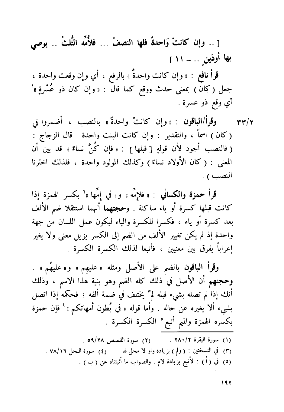 وَقَرَأَ الْبَاقُونَ {وَإِن كَانَت وَاحِدَة} بِالنّصب أضمروا فِي كَانَ اسْما وَالتَّقْدِير وَإِن كَانَت الْبِنْت وَاحِدَة قَالَ الزّجاج فالنصب أَجود لِأَن قَوْله قبلهَا {فَإِن كن نسَاء} قد بَين أَن الْمَعْنى كَانَ الْأَوْلَاد نسَاء وَكَذَلِكَ الْمَوْلُود وَاحِدَة فَلذَلِك اخترنا النصب