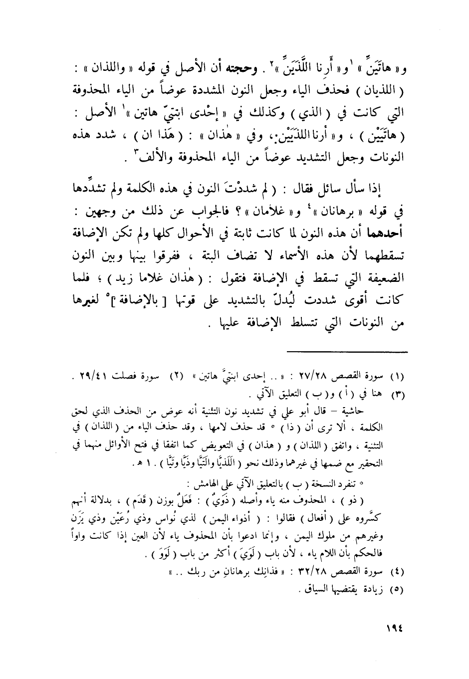 و {هَاتين} و {أرنا الَّذين} وحجته أَن الأَصْل فِي قَوْله {واللذان} اللذيان فَحذف الْيَاء وَجعل النُّون الْمُشَدّدَة عوضا من الْيَاء المحذوفة الَّتِي كَانَت فِي الَّذِي وَكَذَلِكَ فِي {إِحْدَى ابْنَتي هَاتين} الأَصْل هاتيين وأرنا اللذيين وَفِي هَذَانِ هَذَا ان شدد هَذِه النونات وَجعل التَّشْدِيد عوضا من الْيَاء المحذوفة وَالْألف
