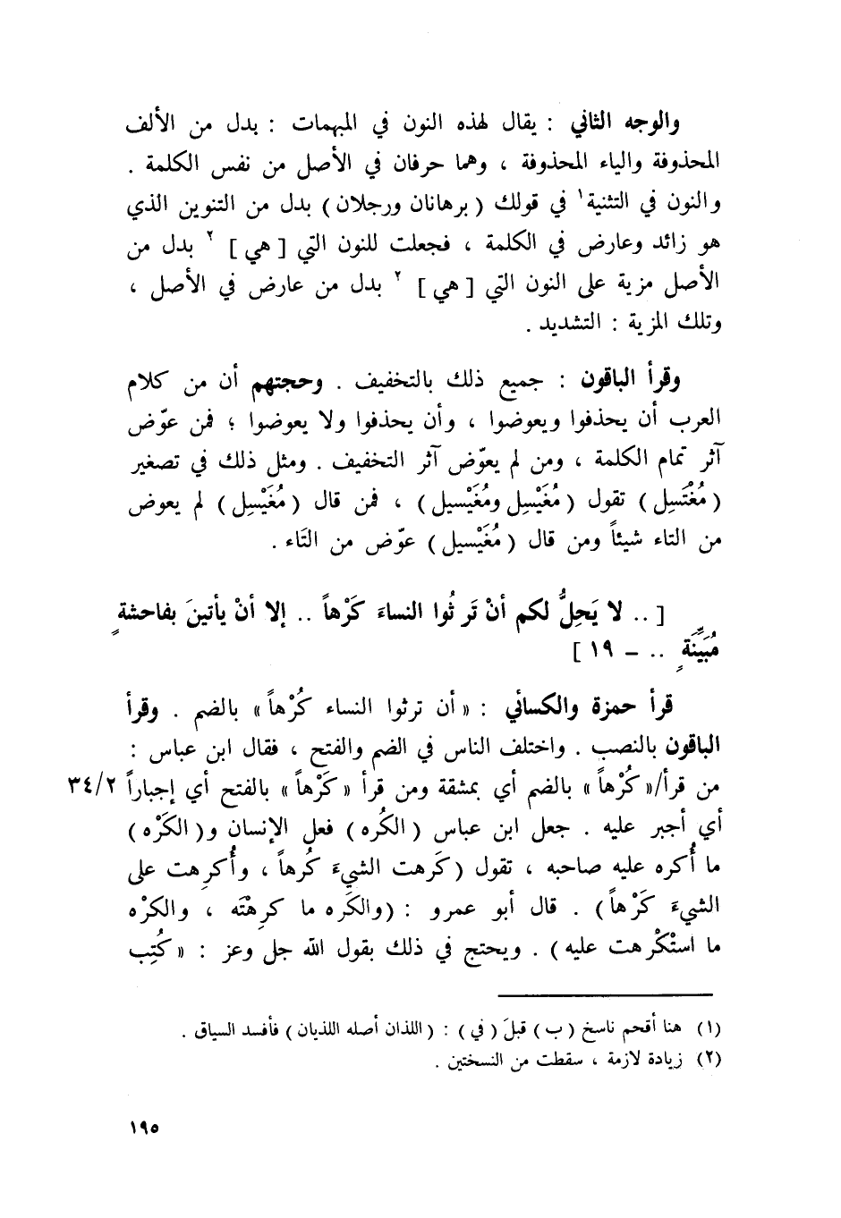 قَرَأَ حَمْزَة وَالْكسَائِيّ {أَن ترثوا النِّسَاء كرها} بِالضَّمِّ قَرَأَ الْبَاقُونَ بِالنّصب وَاخْتلف النَّاس فِي الضَّم وَالْفَتْح فال ابْن عَبَّاس من قَرَأَ {كرها} بِالضَّمِّ أَي بِمَشَقَّة وَمن قَرَأَ {كرها} بِالْفَتْح أَي إجبارا أَي أجبر عَلَيْهِ جعل ابْن عَبَّاس الكره فعل الْإِنْسَان والكره مَا أكره عَلَيْهِ صَاحبه تَقول كرهت الشَّيْء كرها وأكرهت على الشَّيْء كرها قَالَ أَبُو عَمْرو والكره مَا كرهته والكره مَا استكرهت عَلَيْهِ ويحتج فِي ذَلِك بقول الله جلّ وَعز {كتب عَلَيْكُم الْقِتَال وَهُوَ كره لكم}