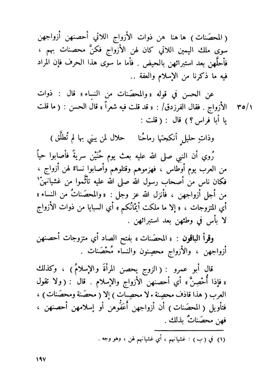 الْمُحْصنَات هَا هُنَا هن ذَوَات الْأزْوَاج اللَّاتِي أحصنهن أَزوَاجهنَّ سوى ملك الْيَمين اللَّاتِي كَانَ لَهُنَّ الْأزْوَاج فَكُن محصنات بهم فأحلهن بعد استبرائهن بِالْحيضِ فَأَما مَا سوى هَذَا الْحَرْف فَإِن المُرَاد فِيهِ مَا ذكرنَا من الْإِسْلَام والعفة