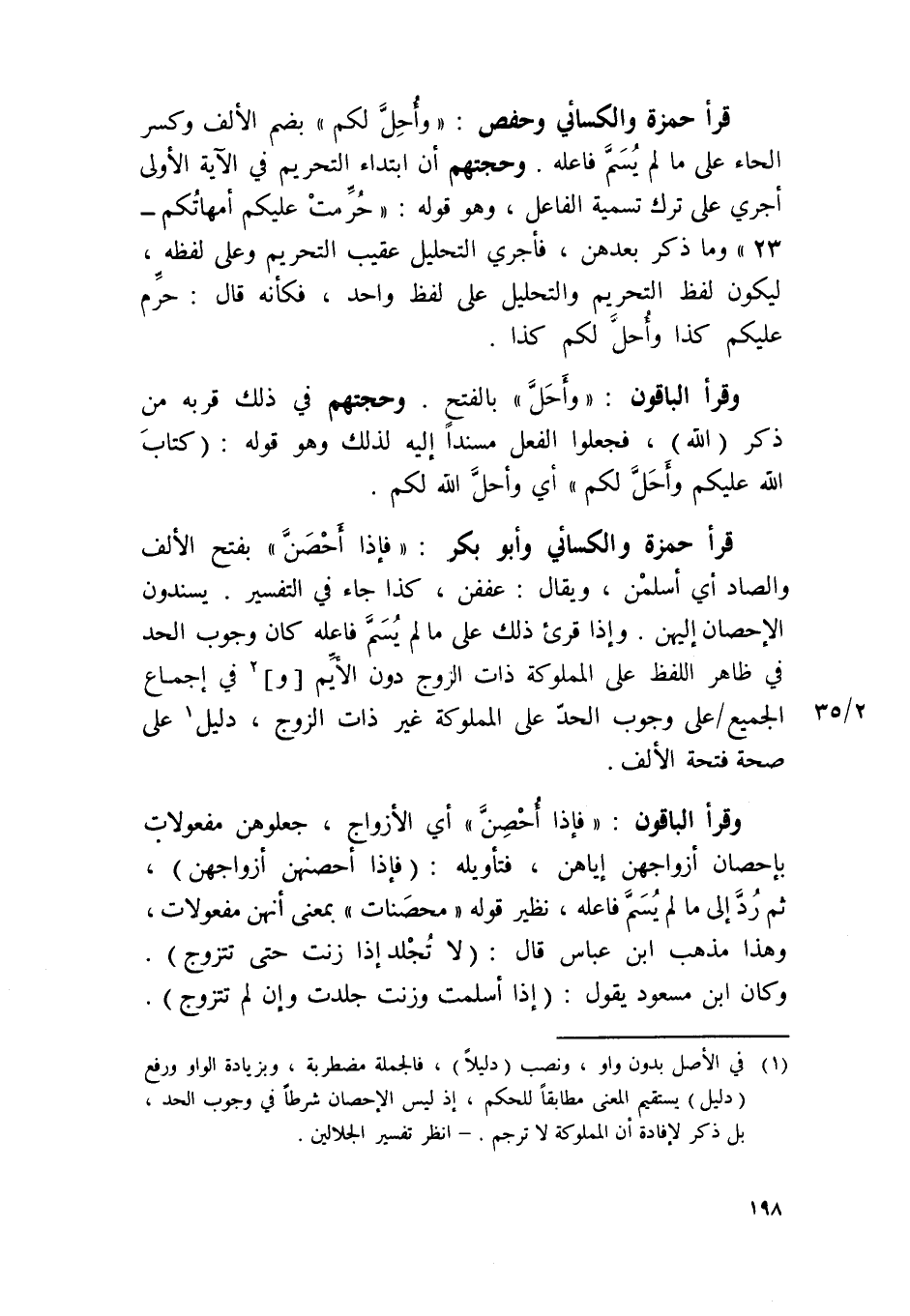 وَقَرَأَ الْبَاقُونَ {فَإِذا أحصن} أَي الْأزْوَاج جعلوهن مفعولات بإحصان أَزوَاجهنَّ إياهن فتأويله فَإِذا أحصنهن أَزوَاجهنَّ ثمَّ رد إِلَى مَا لم يسم فَاعله نَظِير قَوْله {محصنات} بِمَعْنى أَنَّهُنَّ مفعولات وَهَذَا مَذْهَب ابْن عَبَّاس قَالَ لَا تجلد إِذا زنت حَتَّى تتَزَوَّج وَكَانَ ابْن مَسْعُود يَقُول إِذا أسلمت وزنت جلدت وَإِن لم تتَزَوَّج