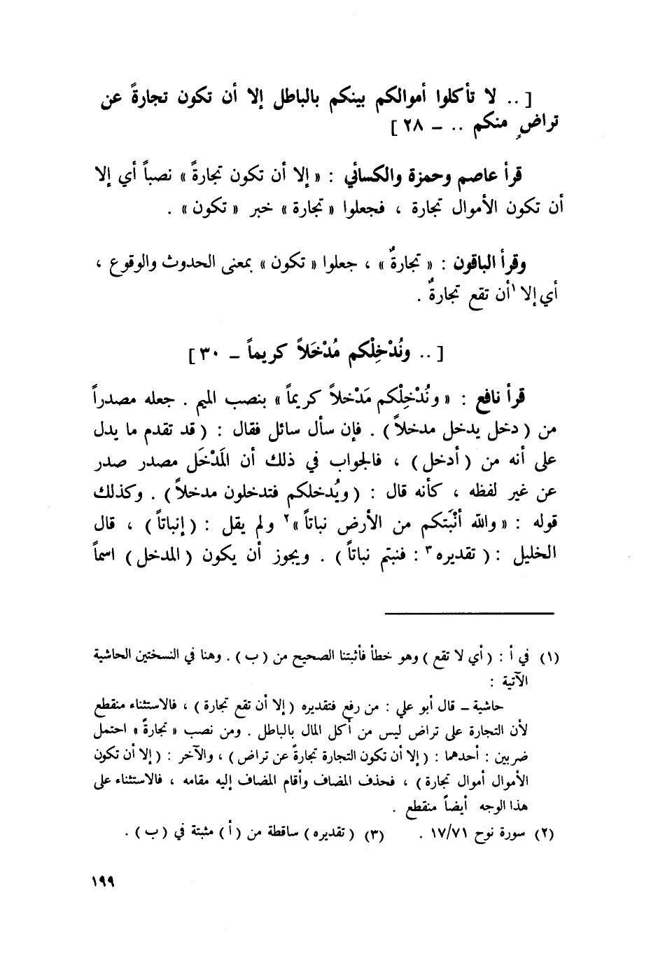 وَقَرَأَ الْبَاقُونَ {تِجَارَة} جعلُوا {تكون} بِمَعْنى الْحُدُوث والوقوع أَي إِلَّا أَن تقع تِجَارَة