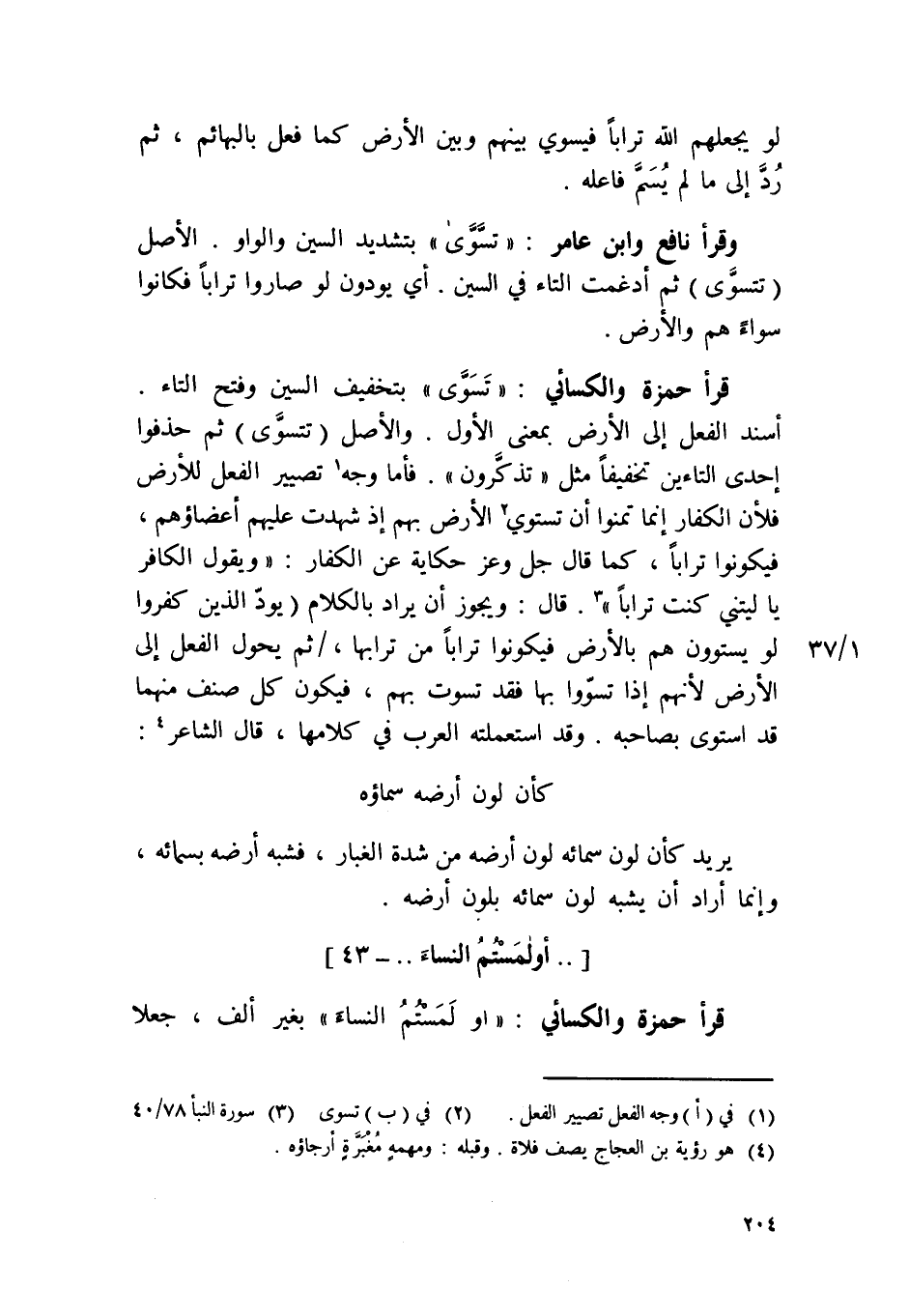 قَرَأَ حَمْزَة وَالْكسَائِيّ {تسوى} بتَخْفِيف السِّين وَفتح التَّاء أسْند الْفِعْل إِلَى الأَرْض بِمَعْنى الأول وَالْأَصْل تتسوى ثمَّ حذفوا إِحْدَى التَّاءَيْنِ تَخْفِيفًا مثل {تذكرُونَ} فَأَما وَجه تصير الْفِعْل للْأَرْض فَلِأَن الْكفَّار إِنَّمَا تمنوا أَن تستوي الأَرْض بهم إِذْ شهِدت عَلَيْهِم أعضاؤهم فَيَكُونُوا تُرَابا كَمَا قَالَ جلّ وَعز حِكَايَة عَن الْكفَّار {وَيَقُول الْكَافِر يَا لَيْتَني كنت تُرَابا} قَالَ وَيجوز أَن يُرَاد بالْكلَام يود الَّذين كفرُوا لَو يستوون هم بِالْأَرْضِ فَيَكُونُوا تُرَابا من ترابها ثمَّ يحول الْفِعْل إِلَى الأَرْض لأَنهم إِذا تسووا بهَا فقد تسوت بهم فَيكون كل صنف مِنْهُمَا قد اسْتَوَى بِصَاحِبِهِ وَقد استعملته الْعَرَب فِي كَلَامهَا قَالَ الشَّاعِر ... كَأَن لون أرضه سماؤه ...