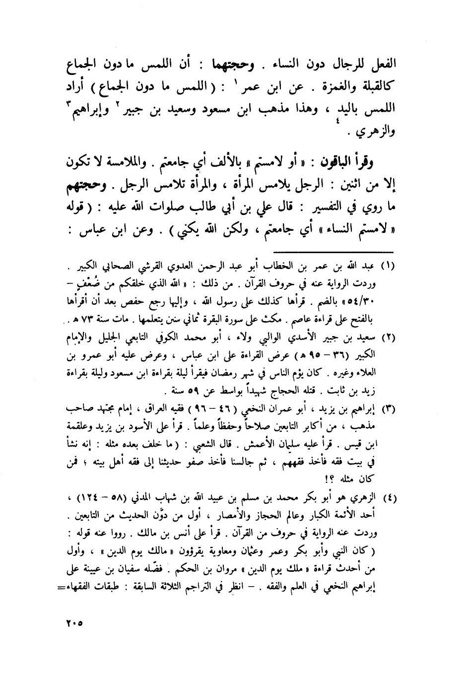 وَقَرَأَ الْبَاقُونَ {أَو لامستم} بِالْألف أَي جامعتم وَالْمُلَامَسَة لَا تكون إِلَّا من اثْنَيْنِ الرجل يلامس الْمَرْأَة وَالْمَرْأَة تلامس الرجل وحجتهم مَا رُوِيَ فِي التَّفْسِير قَالَ عَليّ بن ابي طَالب صلوَات الله عَلَيْهِ قَوْله {لامستم النِّسَاء} أَي جامعتم وَلَكِن الله يكني وَعَن ابْن عَبَّاس