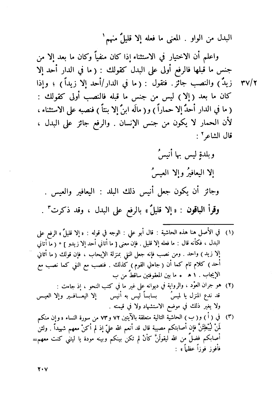 وَاعْلَم أَن الِاخْتِيَار فِي الِاسْتِثْنَاء إِذا كَانَ منفيا وَكَانَ مَا بعد إِلَّا من جنس مَا قبلهَا فالرفع أولى على الْبَدَل كَقَوْلِك مَا فِي الدَّار أحد إِلَّا زيد وَالنّصب جَائِز فَتَقول مَا فِي الدَّار أحد إِلَّا زيدا وَإِذا كَانَ مَا بعد إِلَّا لَيْسَ من جنس مَا قبله فالنصب أولى كَقَوْلِك مَا فِي الدَّار أحد إِلَّا حمارا وَمَاله ابْن إِلَّا بِنْتا فنصبه على الِاسْتِثْنَاء لِأَن الْحمار لَا يكون من جنس الْإِنْسَان وَالرَّفْع جَائِز على الْبَدَل قَالَ الشَّاعِر ... وبلدة لَيْسَ بهَا أنيس ... إِلَّا اليعافير وَإِلَّا العيس ...