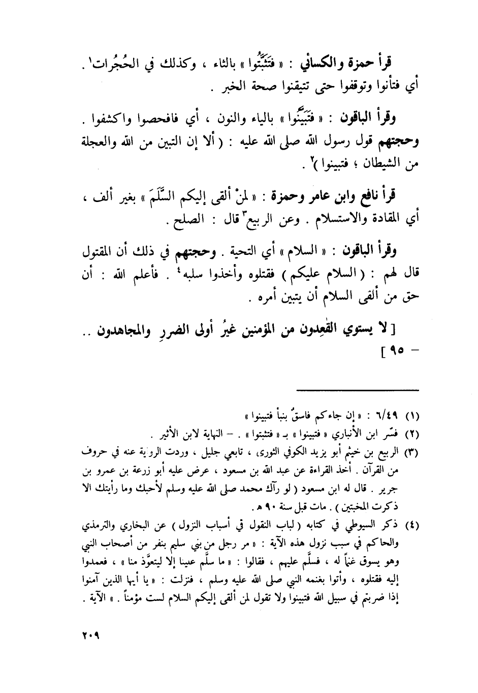 وَقَرَأَ الْبَاقُونَ {فَتَبَيَّنُوا} بِالْيَاءِ وَالنُّون أَي فافحصوا واكشفوا وحجتهم قَول رَسُول الله صلى الله عَلَيْهِ