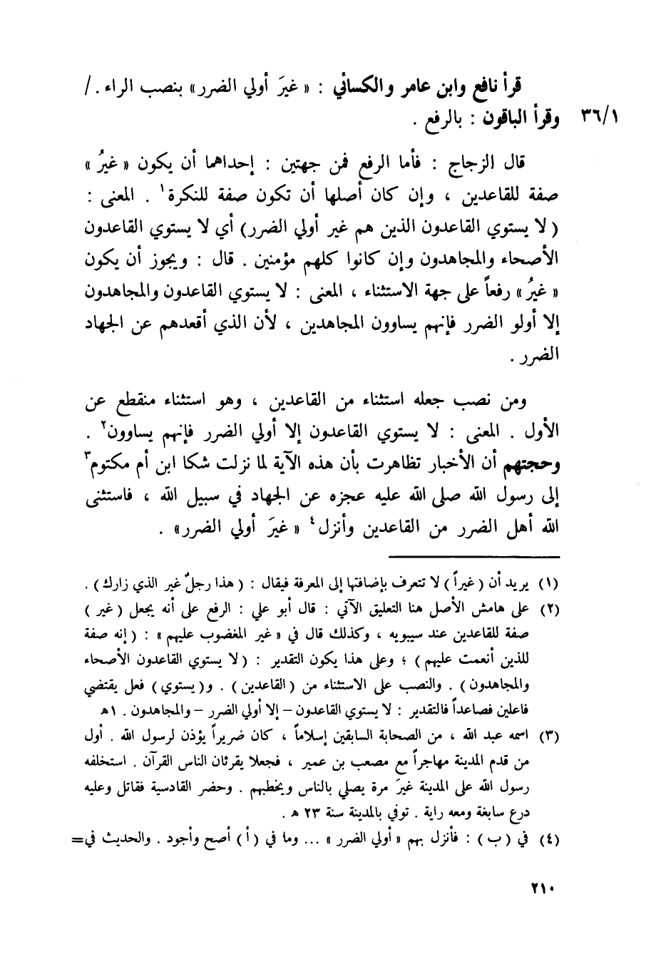 قَرَأَ نَافِع وَابْن عَامر وَالْكسَائِيّ {غير أولي الضَّرَر} بِنصب الرَّاء وَقَرَأَ الْبَاقُونَ بِالرَّفْع