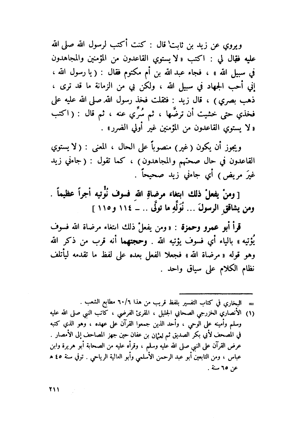 ويروي عَن زيد بن ثَابت قَالَ كنت أكتب لرَسُول اله صلى الله عَلَيْهِ فَقَالَ لي اكْتُبْ / لَا يَسْتَوِي الْقَاعِدُونَ من الْمُؤمنِينَ وَالْمُجَاهِدُونَ فِي سَبِيل الله / فجَاء عبد الله بن أم مَكْتُوم فَقَالَ يَا رَسُول الله إِنِّي أحب الْجِهَاد فِي سَبِيل الله وَلَكِن بِي من الزمانة مَا قد ترى ذهب بَصرِي قَالَ زيد فَثقلَتْ فَخذ رَسُول الله صلى الله عَلَيْهِ على فَخذي حَتَّى خشيت أَن تَرضهَا ثمَّ سري عَنهُ ثمَّ قَالَ اكْتُبْ {لَا يَسْتَوِي الْقَاعِدُونَ من الْمُؤمنِينَ غير أولي الضَّرَر}