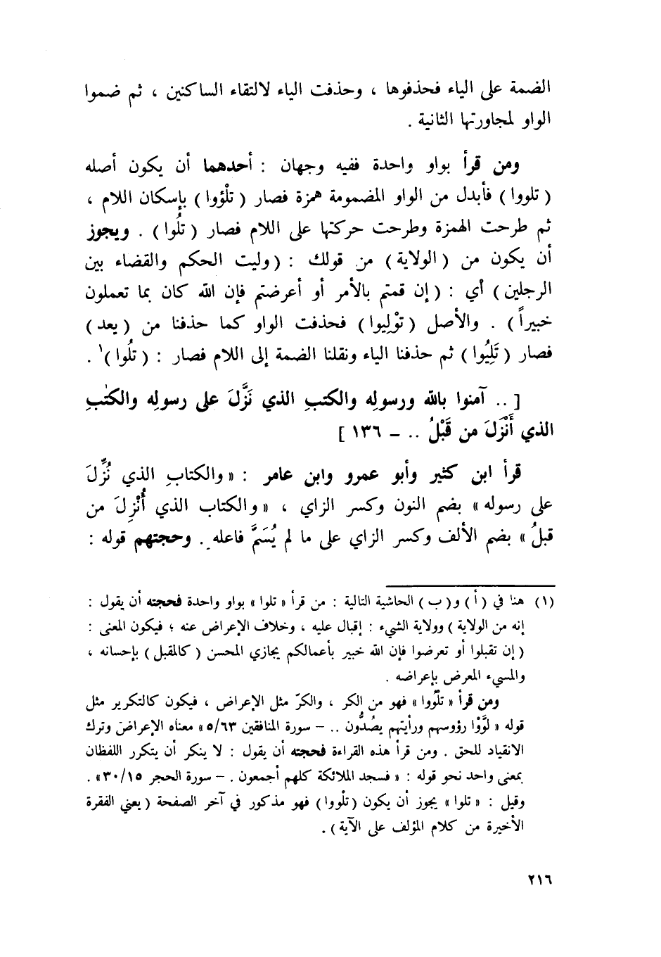 وَمن قَرَأَ بواو وَاحِدَة فَفِيهِ وَجْهَان أَحدهمَا أَن يكون أَصله تلووا فأبدل من الْوَاو المضمومة همزَة فَصَارَ تلؤوا بِإِسْكَان اللَّام ثمَّ طرحت الْهمزَة وطرحت حركتها على اللَّام فَصَارَ تلوا وَيجوز أَن يكون من الْولَايَة من قَوْلك وليت الحكم وَالْقَضَاء بَين الرجلَيْن أَي إِن قُمْتُم بِالْأَمر أَو أعرضتم فَإِن الله كَانَ بِمَا تَعْمَلُونَ خَبِيرا وَالْأَصْل توليوا فحذفت الْوَاو كَمَا حذفنا من يعد فَصَارَ تليوا ثمَّ حذفنا الْيَاء ونقلنا الضمة إِلَى اللَّام فَصَارَ تلوا