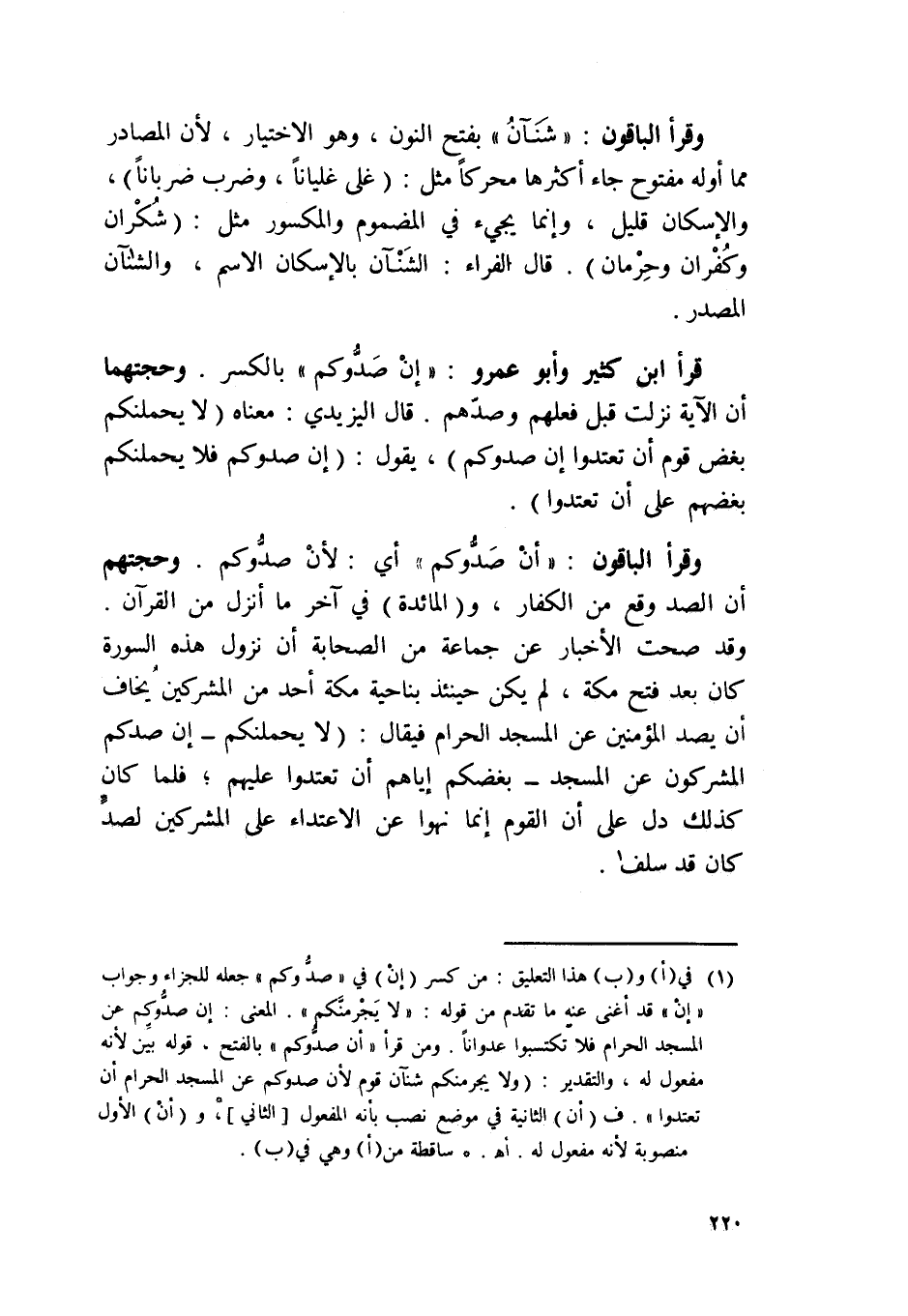 وَقَرَأَ الْبَاقُونَ {شنآن} بِفَتْح النُّون وَهُوَ الِاخْتِيَار لِأَن المصادر مِمَّا أَوله مَفْتُوح جَاءَ أَكْثَرهَا محركا مثل غلى غليانا وَضرب ضربانا والإسكان قَلِيل وَإِنَّمَا يَجِيء فِي المضموم والمكسور مثل شكران وكفران وحرمان قَالَ الْفراء الشنآن بالإسكان الِاسْم والشنآن الْمصدر