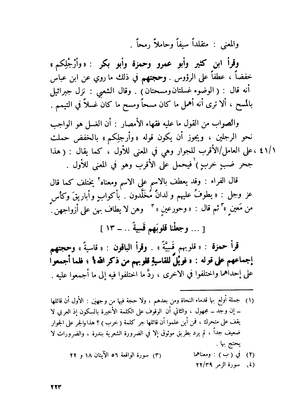 وَالصَّوَاب من القَوْل مَا عَلَيْهِ فُقَهَاء الْأَمْصَار أَن الْغسْل هُوَ الْوَاجِب نَحْو الرجلَيْن وَيجوز أَن يكون قَوْله {وأرجلكم} بالخفض حملت على الْعَامِل الْأَقْرَب للجوار وَهِي فِي الْمَعْنى للْأولِ كَمَا يُقَال هَذَا جُحر ضَب خرب فَيحمل على الْأَقْرَب وَهُوَ فِي الْمَعْنى للْأولِ