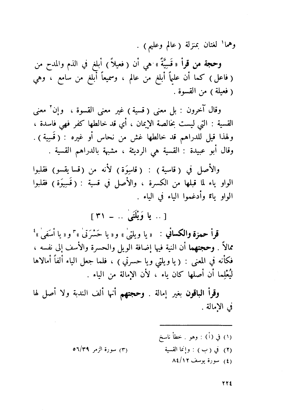 قَرَأَ حَمْزَة وَالْكسَائِيّ {يَا ويلتى} و {يَا حسرتى} و {يَا أسفى} ممالا وحجتهما أَن النِّيَّة فِيهَا إِضَافَة الويل وَالْحَسْرَة والأسف إِلَى نَفسه فَكَأَنَّهُ فِي الْمَعْنى يَا ويلتي وَيَا حسرتي فَلَمَّا جعل الْيَاء ألفا أمالاها ليعلما أَن أَصْلهَا كَانَ يَاء لِأَن الإمالة من الْيَاء