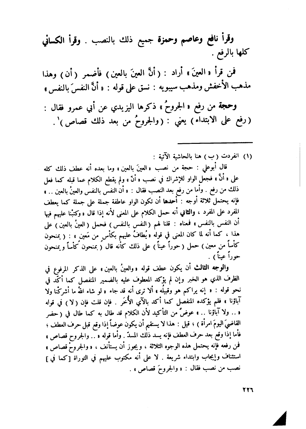 فَمن قَرَأَ {الْعين} أَرَادَ أَن الْعين بِالْعينِ فأضمر أَن وَهَذَا مَذْهَب الْأَخْفَش وَمذهب سِيبَوَيْهٍ نسق على قَوْله {أَن النَّفس بِالنَّفسِ}