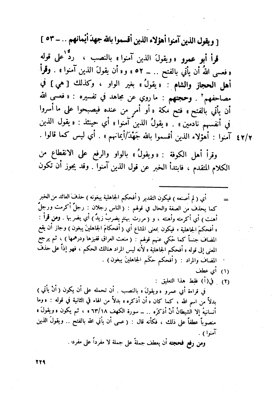 قَرَأَ ابو عَمْرو {وَيَقُول الَّذين آمنُوا} بِالنّصب رد على قَوْله {فَعَسَى الله أَن يَأْتِي بِالْفَتْح} و {أَن يَقُول الَّذين آمنُوا} وَقَرَأَ أهل الْحجاز وَالشَّام / يَقُول / بِغَيْر الْوَاو وَكَذَلِكَ هِيَ فِي مصاحفهم وحجتهم مَا رُوِيَ عَن مُجَاهِد فِي تَفْسِيره {فَعَسَى الله أَن يَأْتِي بِالْفَتْح} فتح مَكَّة {أَو أَمر من عِنْده فيصبحوا على مَا أَسرُّوا فِي أنفسهم نادمين} / يَقُول الَّذين آمنُوا / أَي حِينَئِذٍ / يَقُول الَّذين آمنُوا أَهَؤُلَاءِ الَّذين أَقْسمُوا بِاللَّه جهد أَيْمَانهم / أَي لَيْسَ كَمَا قَالُوا