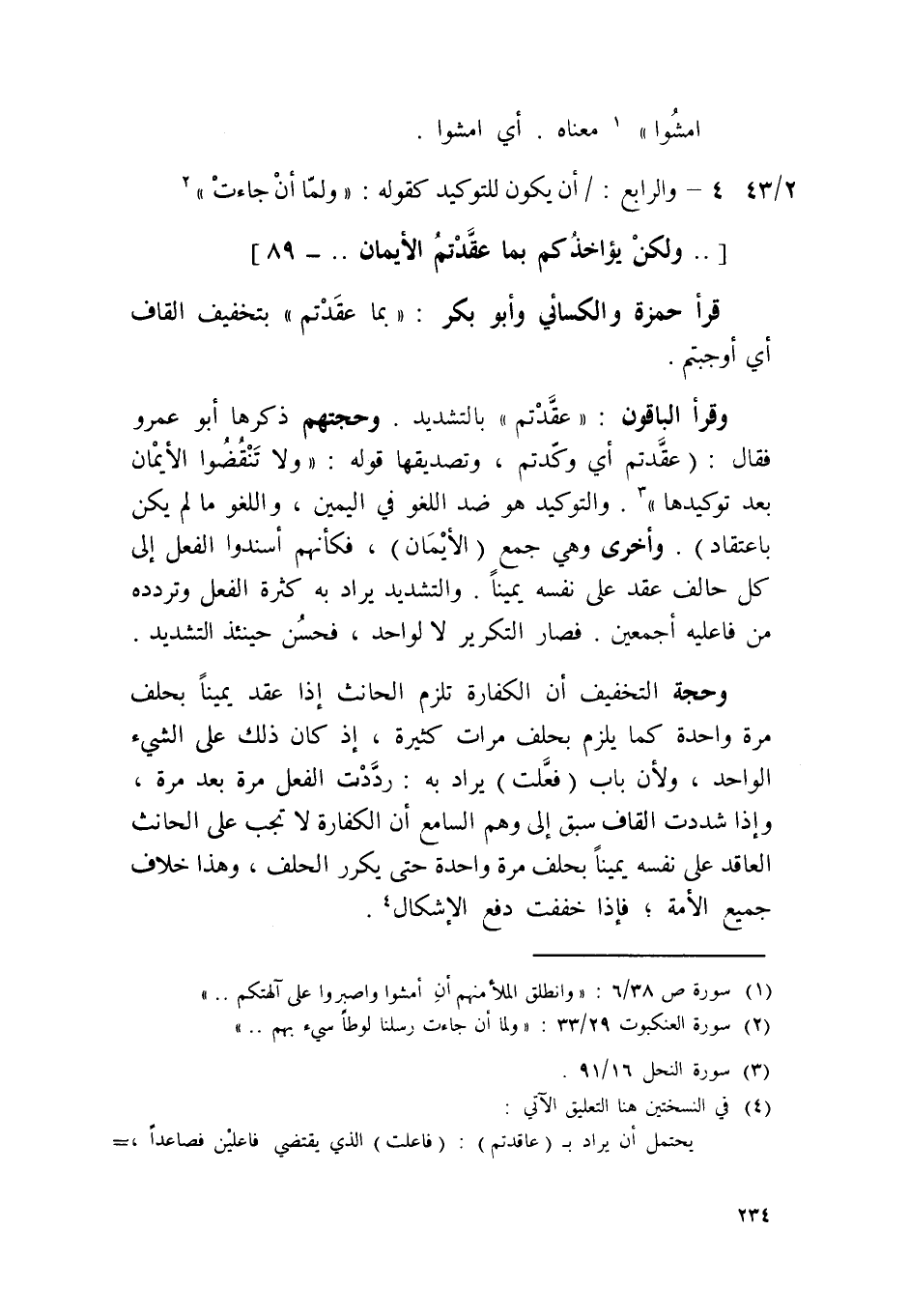 قَرَأَ حَمْزَة وَالْكسَائِيّ وَأَبُو بكر {بِمَا عقدتم} بتَخْفِيف الْقَاف أَي أوجبتم