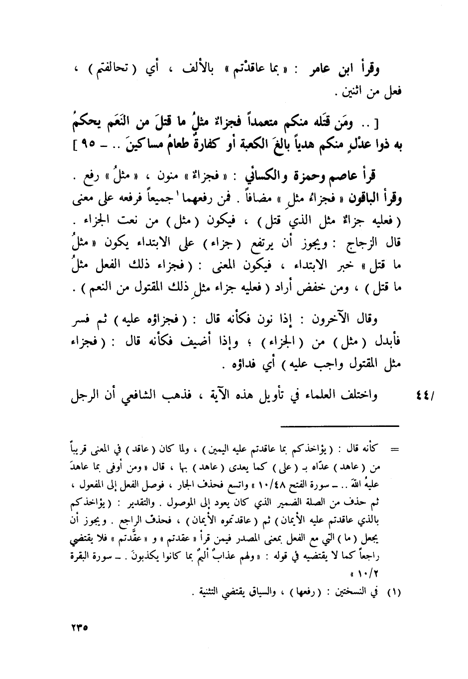 وَقَالَ الْآخرُونَ إِذا نون فَكَأَنَّهُ قَالَ فَجَزَاؤُهُ عَلَيْهِ ثمَّ فسر فأبدل مثل من الْجَزَاء وَإِذا أضيف فَكَأَنَّهُ قَالَ فجزاء مثل الْمَقْتُول وَاجِب عَلَيْهِ أَي فداؤه