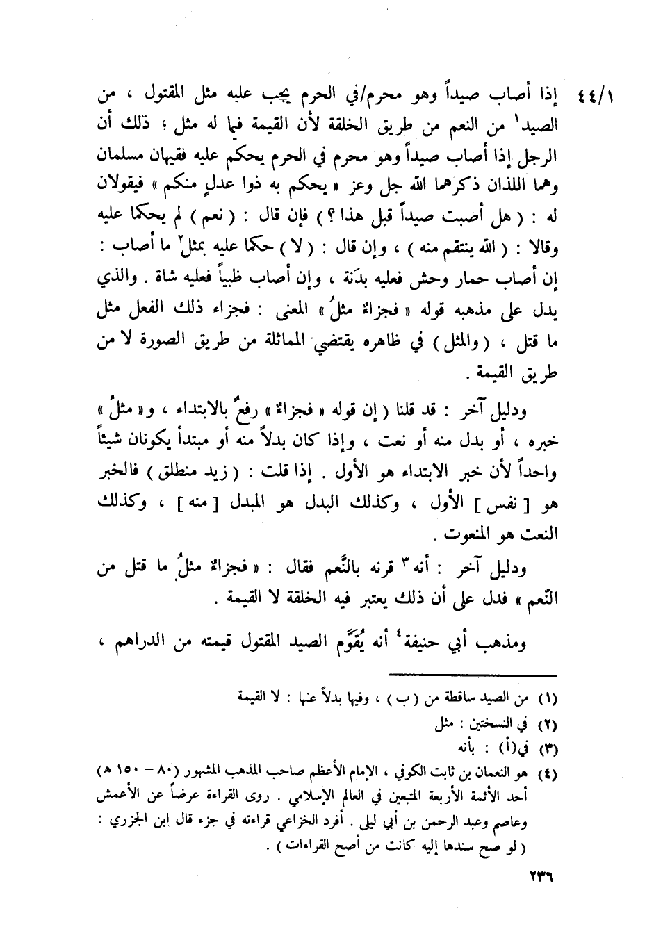 إِذا اصاب صيدا وَهُوَ محرم فِي الْحرم يجب عَلَيْهِ مثل الْمَقْتُول من الصَّيْد من النعم من طَرِيق الْخلقَة لِأَن الْقيمَة فِيمَا لَهُ مثل ذَلِك أَن الرجل إِذا اصاب صيدا وَهُوَ محرم فِي الْحرم يحكم عَلَيْهِ فقيهان مسلمان وهما اللَّذَان ذكرهمَا الله جلّ وَعز {يحكم بِهِ ذَوا عدل مِنْكُم} فَيَقُولَانِ لَهُ هَل أصبت صيدا قبل هَذَا فَإِن قَالَ نعم لم يحكما عَلَيْهِ وَقَالا الله ينْتَقم مِنْهُ وَإِن قَالَ لَا حكما عَلَيْهِ بِمثل مَا أصَاب إِن أصَاب حمَار وَحش فَعَلَيهِ بَدَنَة وَإِن أصَاب ظَبْيًا فَعَلَيهِ شَاة وَالَّذِي يدل على مذْهبه قَوْله {فجزاء مثل} الْمَعْنى فجزاء ذَلِك الْفِعْل مثل مَا قتل والمثل فِي ظَاهره يَقْتَضِي الْمُمَاثلَة من طَرِيق الصُّورَة لَا من طَرِيق الْقيمَة