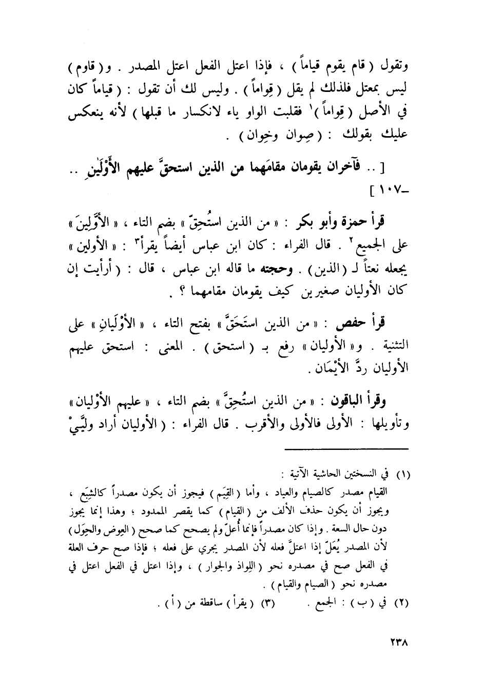 قَرَأَ حَمْزَة وَأَبُو بكر {من الَّذين اسْتحق} بِضَم التَّاء / الولين / على الْجَمِيع قَالَ الْفراء كَانَ ابْن عَبَّاس أَيْضا يقْرَأ {الْأَوَّلين} يَجعله نعتا ل الَّذين وحجته مَا قَالَه ابْن عَبَّاس قَالَ أَرَأَيْت إِن كَانَ الأوليان صغيرين كَيفَ يقومان مقامهما