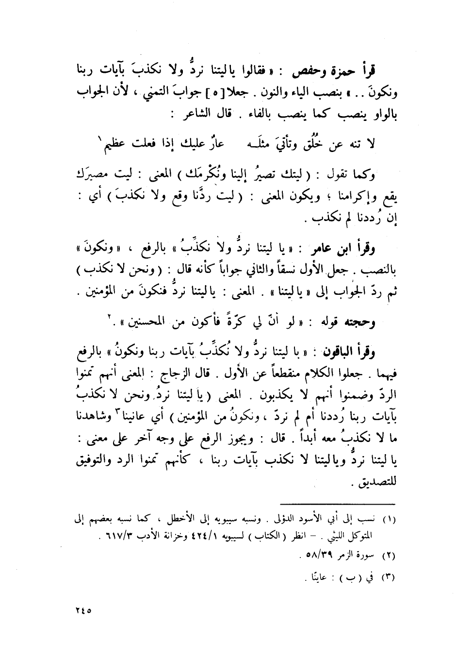 قَرَأَ حَمْزَة وَحَفْص {فَقَالُوا يَا ليتنا نرد وَلَا نكذب بآيَات رَبنَا ونكون} بِنصب الْيَاء وَالنُّون جعلاه جَوَاب التَّمَنِّي لِأَن الْجَواب بِالْوَاو ينصب كَا ينصب بِالْفَاءِ قَالَ الشَّاعِر ... لَا تنه عَن خلق وَتَأْتِي مثله ... عَار عَلَيْك إِذا فعلت عَظِيم ...