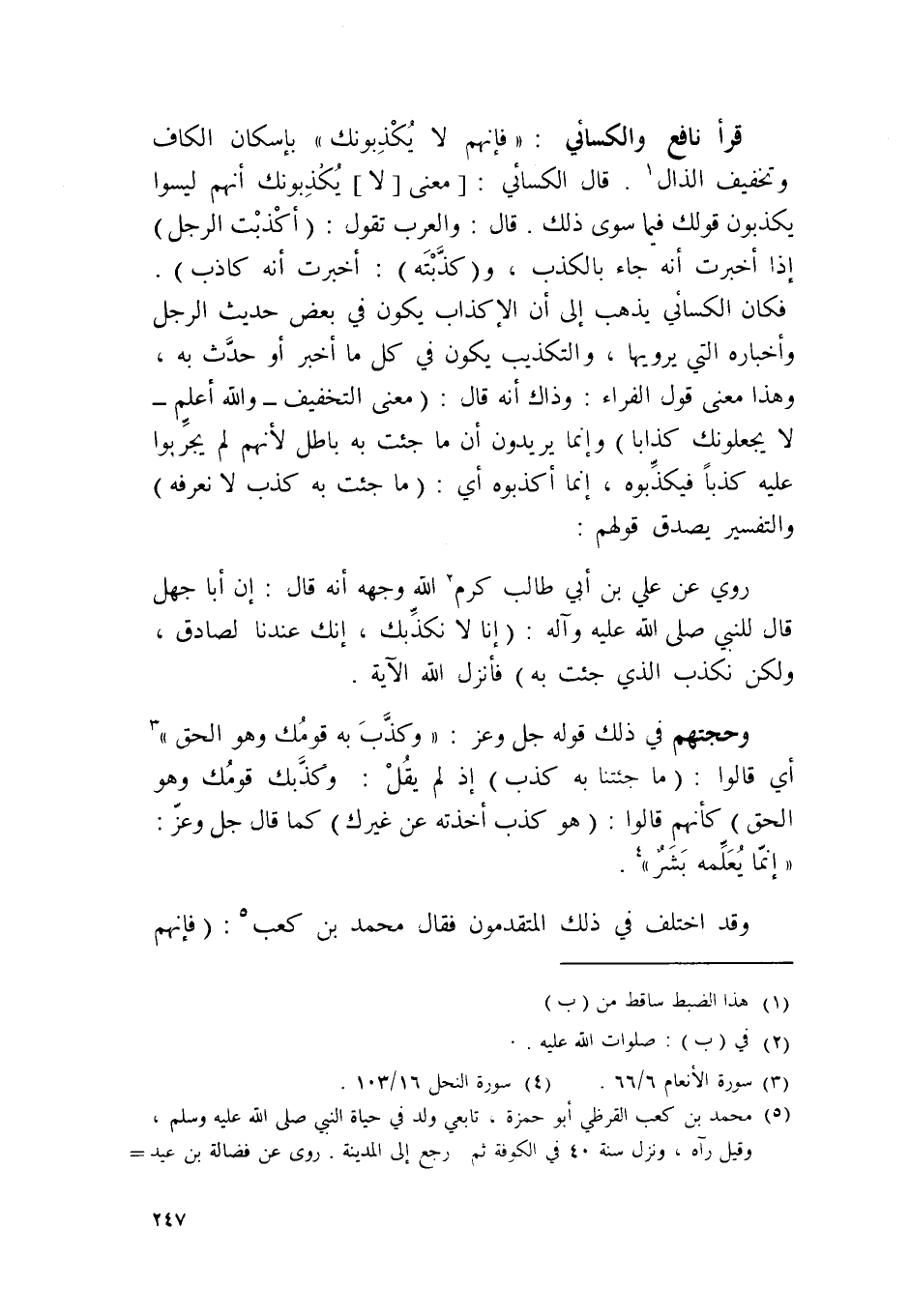 قَرَأَ نَافِع وَالْكسَائِيّ {فَإِنَّهُم لَا يكذبُونَك} بِإِسْكَان الْكَاف وَتَخْفِيف الذَّال قَالَ الْكسَائي معنى لَا يكذبُونَك أَنهم لَيْسُوا يكذبُون قَوْلك فِيمَا سوى ذَلِك قَالَ وَالْعرب تَقول أكذبت الرجل إِذْ إخبرت أَنه جَاءَ بِالْكَذِبِ وكذبته أخْبرت أَنه كَاذِب فَكَانَ الْكسَائي يذهب إِلَى أَن الإكذاب يكون فِي بعض حَدِيث الرجل وأخباره الَّتِي يَرْوِيهَا والتكذيب يكون فِي كل مَا أخبر أَو حدث بِهِ وَهَذَا معنى قَول الْفراء وَذَاكَ أَنه قَالَ معنى التَّخْفِيف وَالله أعلم لَا يجعلونك كذابا وَإِنَّمَا يُرِيدُونَ أَن مَا جِئْت بِهِ بَاطِل لأَنهم لم يجربوا عَلَيْهِ كذبا فيكذبوه إِنَّمَا أكذبوه أَي مَا جِئْت بِهِ كذب لَا نعرفه وَالتَّفْسِير يصدق قَوْلهم