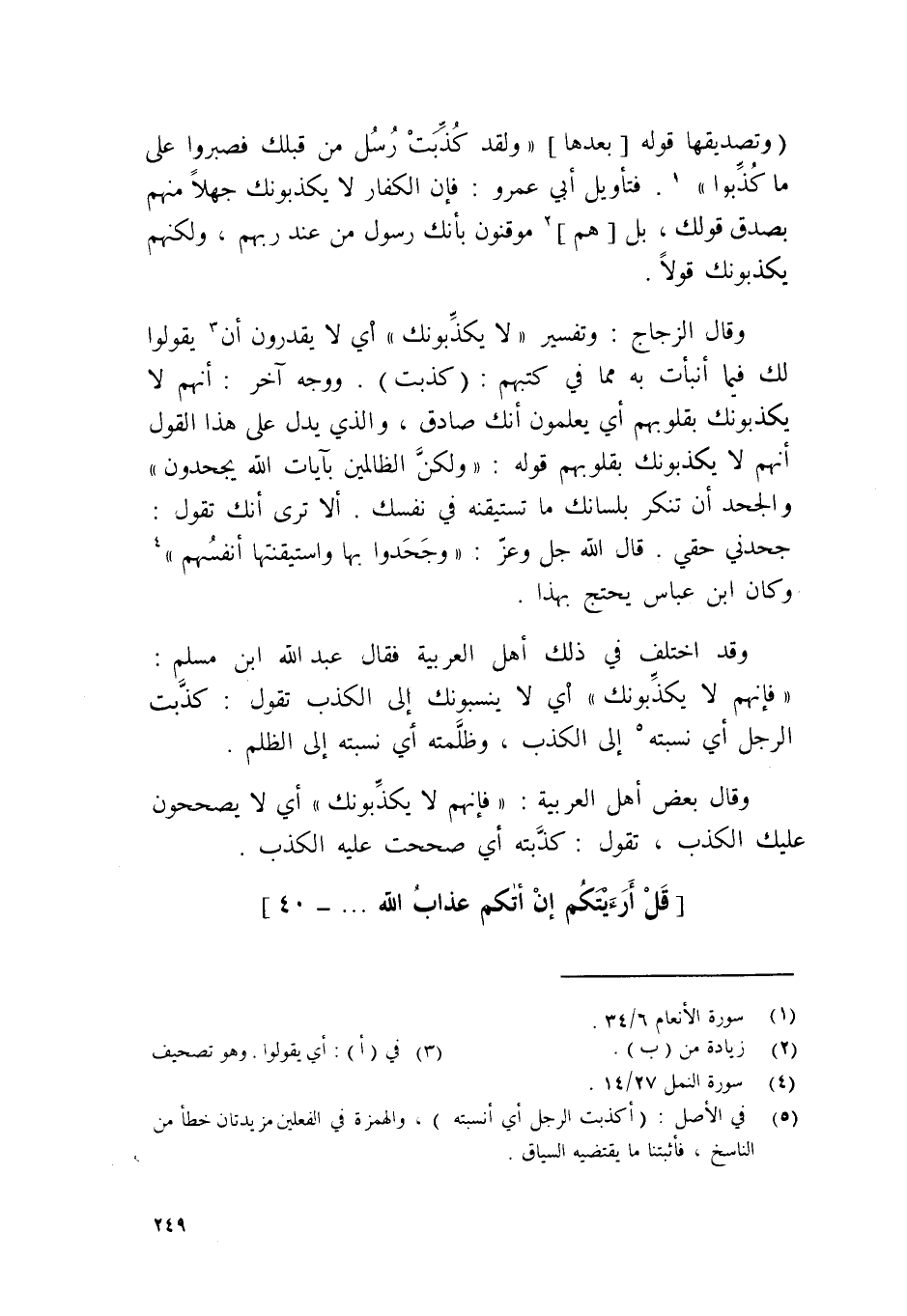 وَقَالَ الزّجاج وَتَفْسِير {لَا يكذبُونَك} أَي لَا يقدرُونَ أَن يَقُولُوا لَك فِيمَا أنبأت بِهِ مِمَّا فِي كتبهمْ كذبت وَوجه آخر أَنهم لَا يكذبُونَك بقلوبهم أَي يعلمُونَ أَنَّك صَادِق وَالَّذِي يدل على هَذَا القَوْل أَنهم لَا يكذبُونَك بقلوبهم قَوْله {وَلَكِن الظَّالِمين بآيَات الله يجحدون} والجحد أَن تنكر بلسانك مَا تستيقنه فِي نَفسك أَلا ترى أَنَّك تَقول جحدني حَقي قَالَ الله جلّ وَعز {وجحدوا بهَا واستيقنتها أنفسهم} وَكَانَ ابْن عَبَّاس يحْتَج بِهَذَا