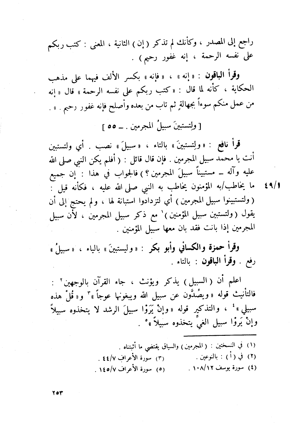 قَرَأَ نَافِع {ولتستبين} بِالتَّاءِ {سَبِيل} نصب أَي ولتستبين أَنْت يَا مُحَمَّد سَبِيل الْمُجْرمين فَإِن قَالَ قَائِل أفلم يكن النَّبِي صلى الله عَلَيْهِ وَآله مستبينا سَبِيل الْمُجْرمين فَالْجَوَاب فِي هَذَا إِن جَمِيع مَا يُخَاطب بِهِ الْمُؤْمِنُونَ يُخَاطب بِهِ النَّبِي صلى الله عَلَيْهِ فَكَأَنَّهُ قيل ولتستبينوا سَبِيل الْمُجْرمين أَي لتزدادوا استبانة لَهَا وَلم يحْتَج إِلَى أَن يَقُول ولتستبين سَبِيل الْمُؤمنِينَ مَعَ ذكر سَبِيل الْمُجْرمين لِأَن سَبِيل الْمُجْرمين إِذا بَانَتْ فقد بَان مَعهَا سَبِيل الْمُؤمنِينَ