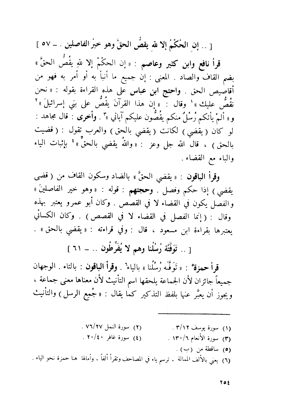 قَرَأَ نَافِع وَابْن كثير وَعَاصِم {إِن الحكم إِلَّا لله يقص الْحق} بِضَم الْقَاف وَالصَّاد الْمَعْنى إِن جَمِيع مَا أنبأ بِهِ أَو أَمر بِهِ فَهُوَ من أقاصيص الْحق وَاحْتج ابْن عَبَّاس على هَذِه الْقِرَاءَة بقوله {نَحن نقص عَلَيْك} وَقَالَ {إِن هَذَا الْقُرْآن يقص على بني إِسْرَائِيل} و {ألم يأتكم رسل مِنْكُم يقصون عَلَيْكُم آياتي} وَأُخْرَى قَالَ مُجَاهِد لَو كَانَ يقْضِي لكَانَتْ يقْضِي بِالْحَقِّ وَالْعرب تَقول قضيت بِالْحَقِّ قَالَ الله جلّ وَعز {وَالله يقْضِي بِالْحَقِّ} بِإِثْبَات الْيَاء وَالْبَاء مَعَ الْقَضَاء