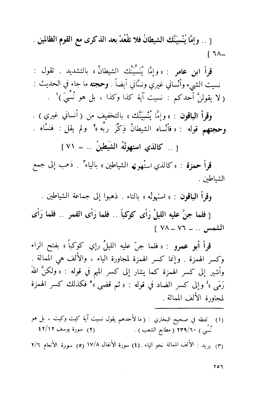 وَقَرَأَ الْبَاقُونَ {وَإِمَّا ينسينك} بِالتَّخْفِيفِ من أنساني غَيْرِي وحجتهم قَوْله {فأنساه الشَّيْطَان ذكر ربه} وَلم يقل فنساه