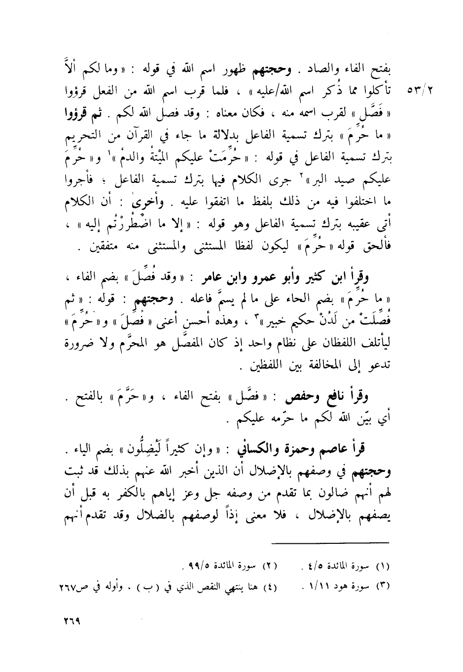 بِفَتْح الْفَاء وَالصَّاد وحجتهم ظُهُور اسْم الله فِي قَوْله {وَمَا لكم أَلا تَأْكُلُوا مِمَّا ذكر اسْم الله عَلَيْهِ} فَلَمَّا قرب اسْم الله من الْفِعْل قرؤوا فصل لقرب اسْمه مِنْهُ فَكَانَ مَعْنَاهُ وَقد فصل الله لكم ثمَّ قرؤوا {مَا حرم} بترك تَسْمِيَة الْفَاعِل بِدلَالَة مَا جَاءَ فِي الْقُرْآن من التَّحْرِيم بترك تَسْمِيَة الْفَاعِل فِي قَوْله {حرمت عَلَيْكُم الْميتَة وَالدَّم} و {وَحرم عَلَيْكُم صيد الْبر} جرى الْكَلَام فِيهَا بترك تَسْمِيَة الْفَاعِل فأجروا مَا اخْتلفُوا فِيهِ من ذَلِك بِلَفْظ مَا اتَّفقُوا عَلَيْهِ وَأُخْرَى أَن الْكَلَام أَتَى عَقِيبه بترك تَسْمِيَة الْفَاعِل وَهُوَ قَوْله {إِلَّا مَا اضطررتم إِلَيْهِ} فَألْحق قَول {حرم} ليَكُون لفظا الْمُسْتَثْنى والمستثنى مِنْهُ متفقين