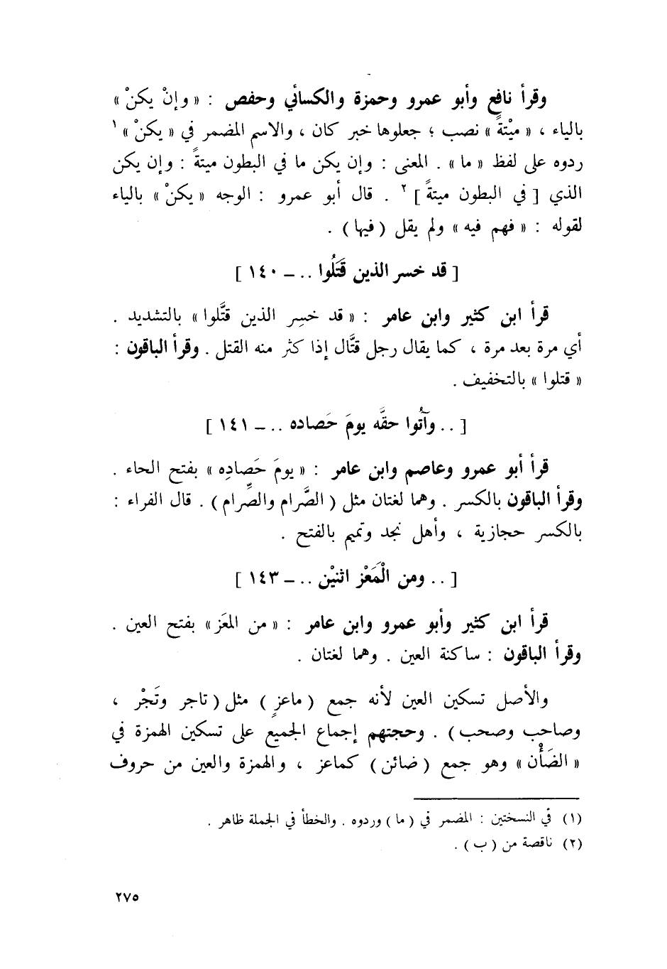 وَقَرَأَ نَافِع وَأَبُو عَمْرو وَحَمْزَة الْكسَائي وَحَفْص {وَإِن يكن} بِالْيَاءِ {ميتَة} نصب جعلوها خبر كَانَ وَالِاسْم الْمُضمر فِي {يكن} ردُّوهُ على لفظ مَا الْمَعْنى وَإِن يكن فِي فِي الْبُطُون ميتَة وَإِن يكن الَّذِي فِي الْبُطُون ميتَة قَالَ أَبُو عَمْرو الْوَجْه {يكن} بِالْيَاءِ لقَوْله {فهم فِيهِ} وَلم يقل فِيهَا