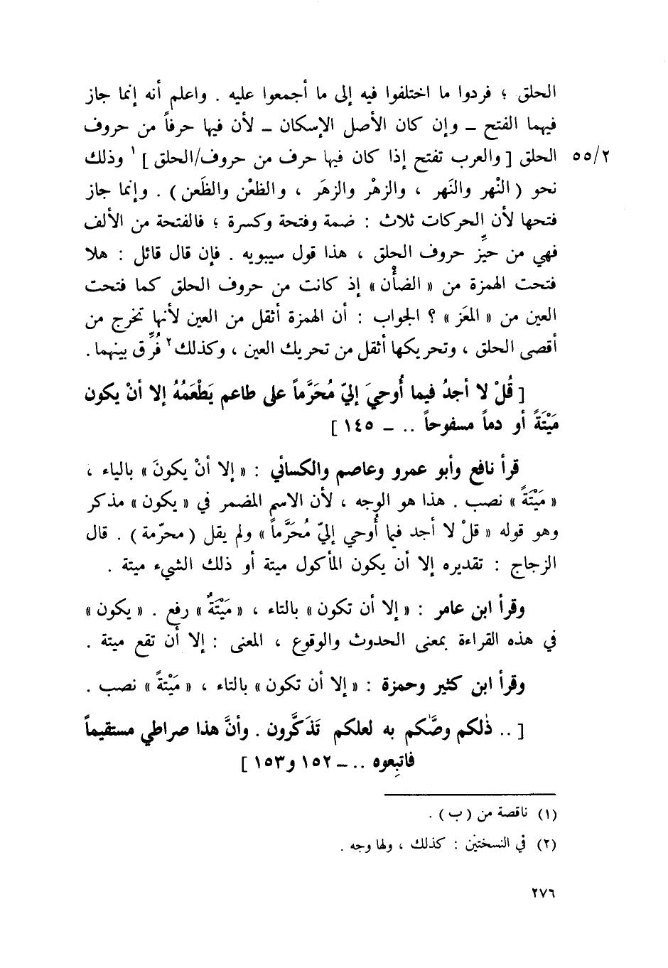 قَرَأَ نَافِع وَأَبُو عَمْرو وَعَاصِم وَالْكسَائِيّ {إِلَّا أَن يكون} بِالْيَاءِ {ميتَة} نصب هَذَا هُوَ الْوَجْه لِأَن الِاسْم الْمُضمر فِي {يكون} مُذَكّر وَهُوَ قَوْله {قل لَا أجد فِيمَا أُوحِي إِلَيّ محرما} وَلم يقل مُحرمَة قَالَ الزّجاج تَقْدِيره إِلَّا أَن يكون الْمَأْكُول ميتَة أَو ذَلِك الشَّيْء ميتَة