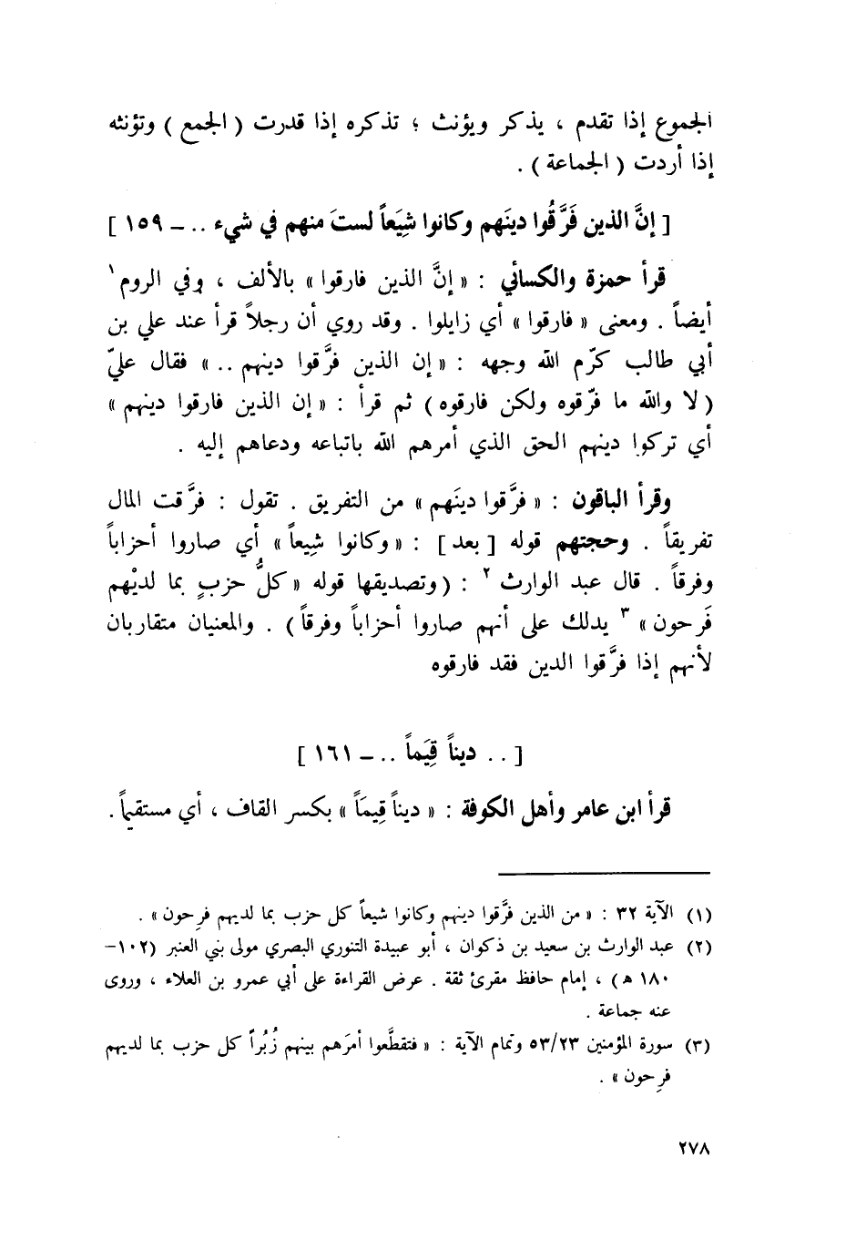 قَرَأَ حَمْزَة وَالْكسَائِيّ / إِن الَّذين فارقوا / بالأل وَفِي الرّوم أَيْضا وَمعنى / فارقوا / أَي زايلوا وَقد رُوِيَ أَن رجلا قَرَأَ عِنْد عَليّ بن أبي طَالب كرم الله وَجهه {إِن الَّذين فرقوا} دينهم فَقَالَ عَليّ لَا وَالله مَا فرقوه وَلَكِن فارقوه ثمَّ قَرَأَ / إِن الَّذين فارقوا دينهم / أَي تركُوا دينهم الْحق الَّذِي أَمرهم الله باتباعه ودعاهم إِلَيْهِ