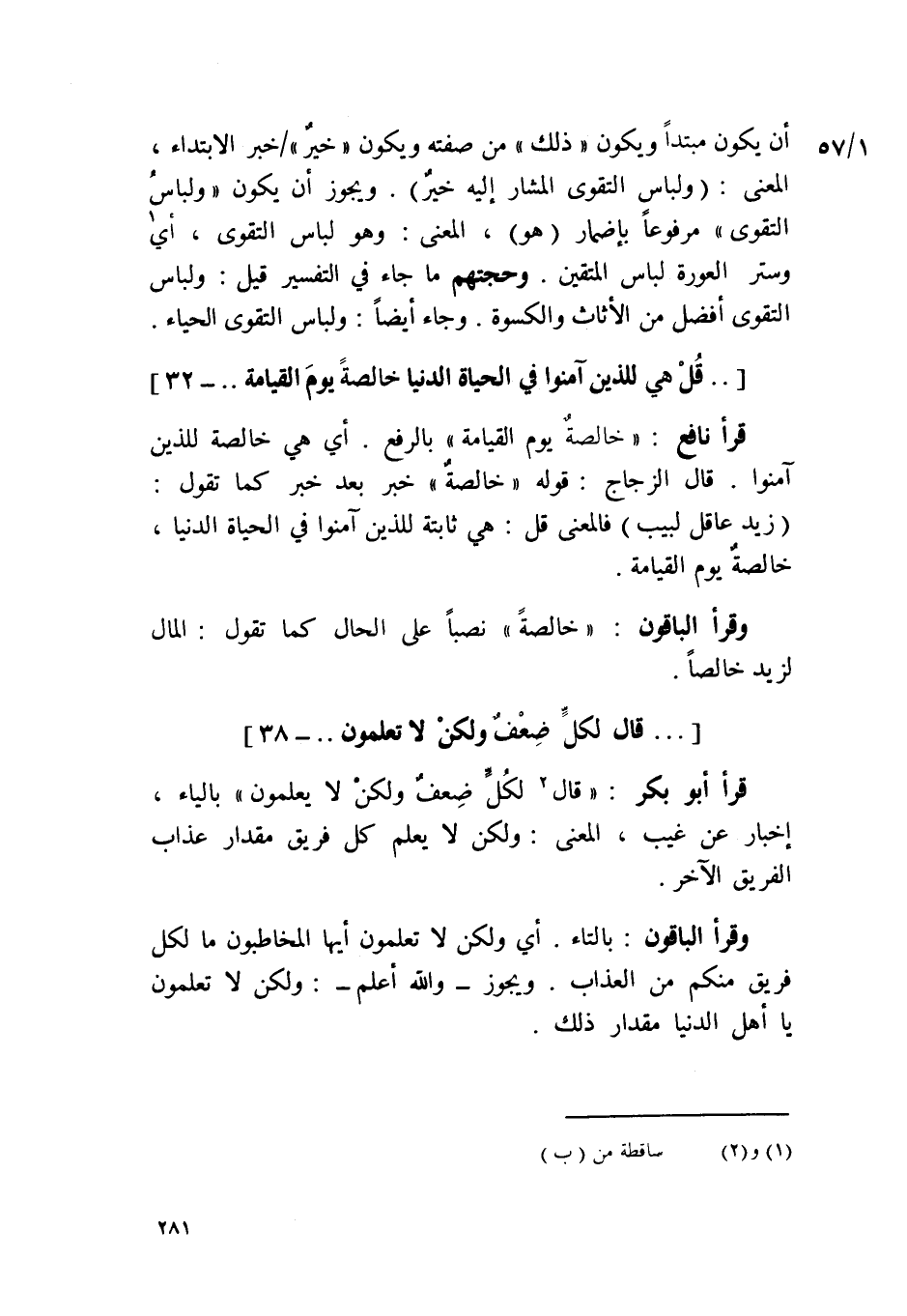 قَرَأَ أَبُو بكر / قَالَ لكل ضعف وَلَكِن لَا يعلمُونَ / بِالْيَاءِ إِخْبَار عَن غيب الْمَعْنى وَلَكِن لَا يعلم كل فريق مِقْدَار عَذَاب الْفَرِيق الآخر