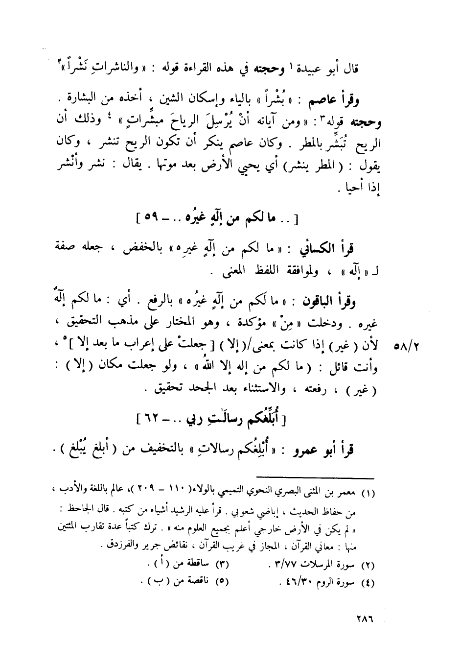قَالَ أَبُو عُبَيْدَة وحجته فِي هَذِه الْقِرَاءَة قَوْله {والناشرات نشرا}