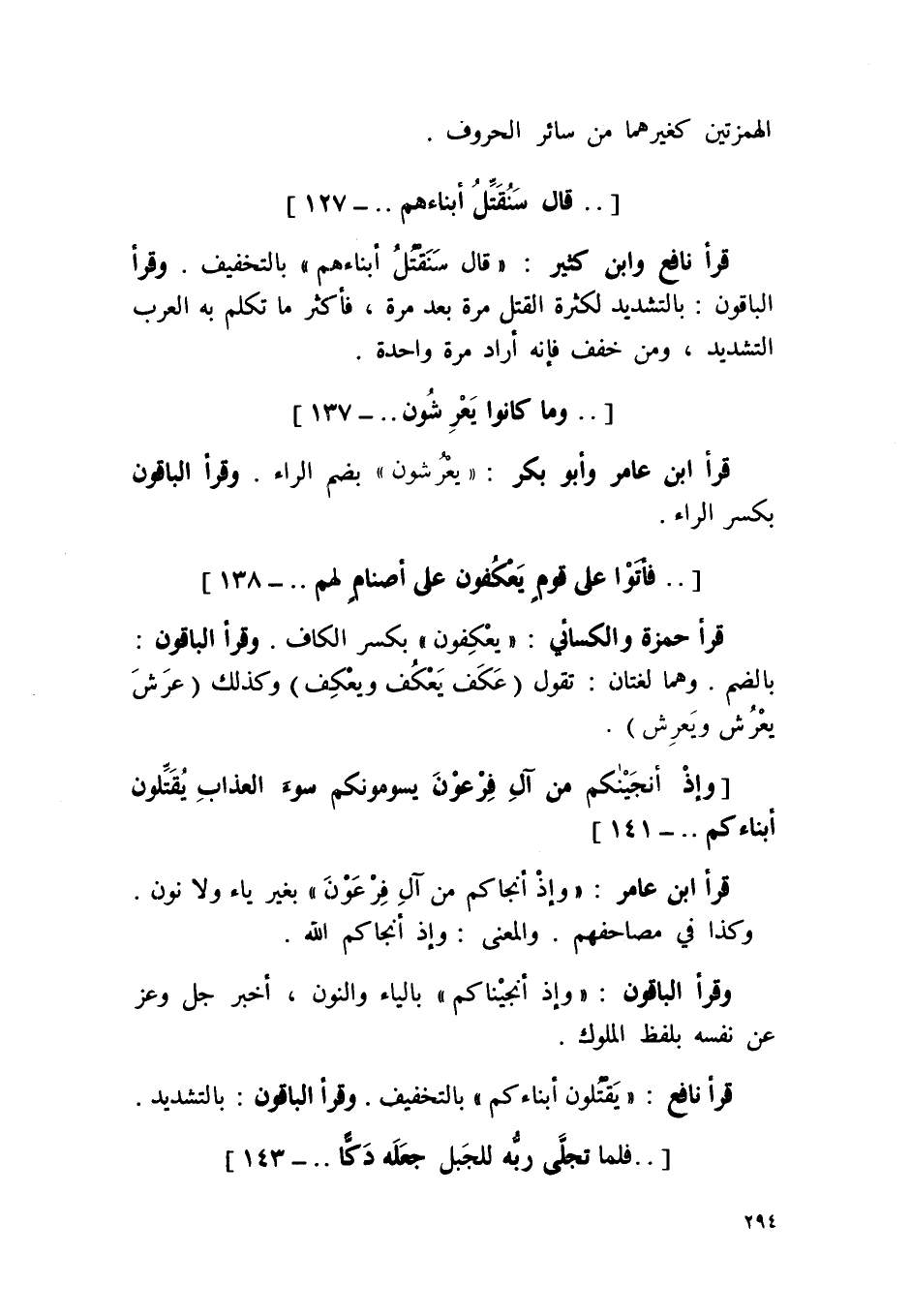 قَرَأَ نَافِع وَابْن كثير {قَالَ سنقتل أَبْنَاءَهُم} بِالتَّخْفِيفِ وَقَرَأَ الْبَاقُونَ بِالتَّشْدِيدِ لِكَثْرَة الْقَتْل مرّة بعد مرّة فَأكْثر مَا تكلم بِهِ الْعَرَب التَّشْدِيد وَمن خفف فَإِنَّهُ أَرَادَ مرّة وَاحِدَة