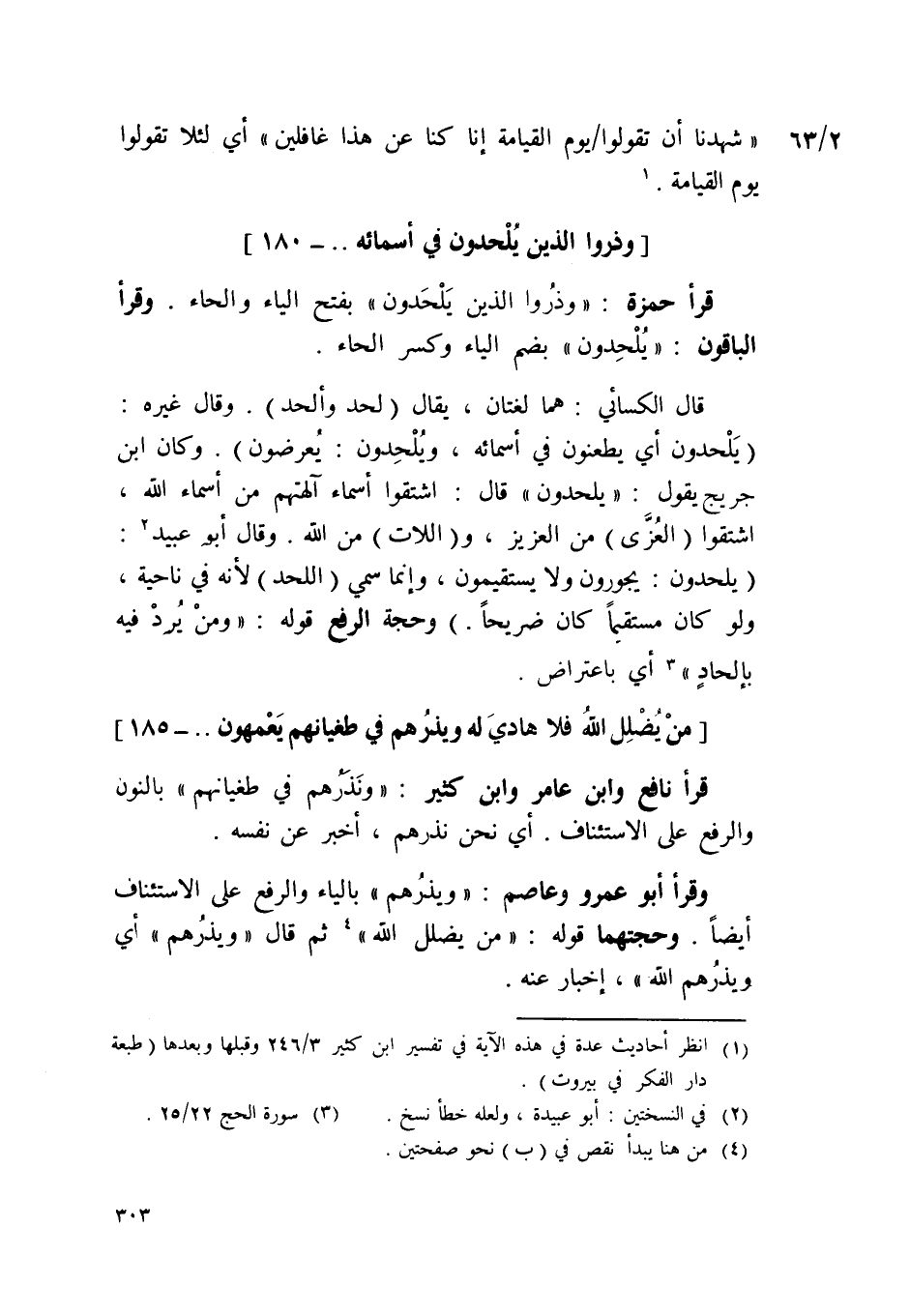 قَرَأَ حَمْزَة {وذروا الَّذين يلحدون} بِفَتْح الْيَاء والحاء وَقَرَأَ الْبَاقُونَ {يلحدون} بِضَم الْيَاء وَكسر الْحَاء