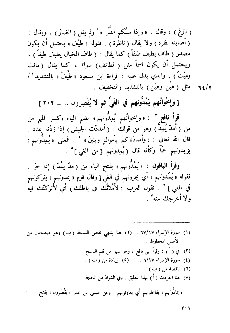قَرَأَ نَافِع {وإخوانهم يمدونهم} بِضَم الْيَاء وَكسر الْمِيم من من أمد يمد وَهُوَ من قَوْلك أمددت الْجَيْش إِذا زِدْته بمدد قَالَ الله تَعَالَى {وأمددناكم بأموال وبنين} فَمَعْنَى {يمدونهم} يزيدونهم غيا وَكَأَنَّهُ قَالَ يمدونهم من الغي