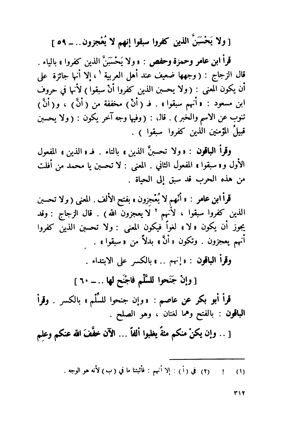 قَرَأَ ابْن عَامر وَحَمْزَة وَحَفْص {وَلَا يَحسبن الَّذين كفرُوا} بِالْيَاءِ قَالَ الزّجاج وَجههَا ضَعِيف عِنْد أهل الْعَرَبيَّة إِلَّا أَنَّهَا جَائِزَة على أَن يكون الْمَعْنى وَلَا يَحسبن الَّذين كفرُوا أَن سبقوا لِأَنَّهَا فِي حُرُوف ابْن مَسْعُود / أَنهم سبقوا / ف أَن مُخَفّفَة من أَن وَأَن تنوب عَن الِاسْم وَالْخَبَر قَالَ وفيهَا وَجه آخر يكون وَلَا يَحسبن قبيل الْمُؤمنِينَ الَّذين كفرُوا سبقوا